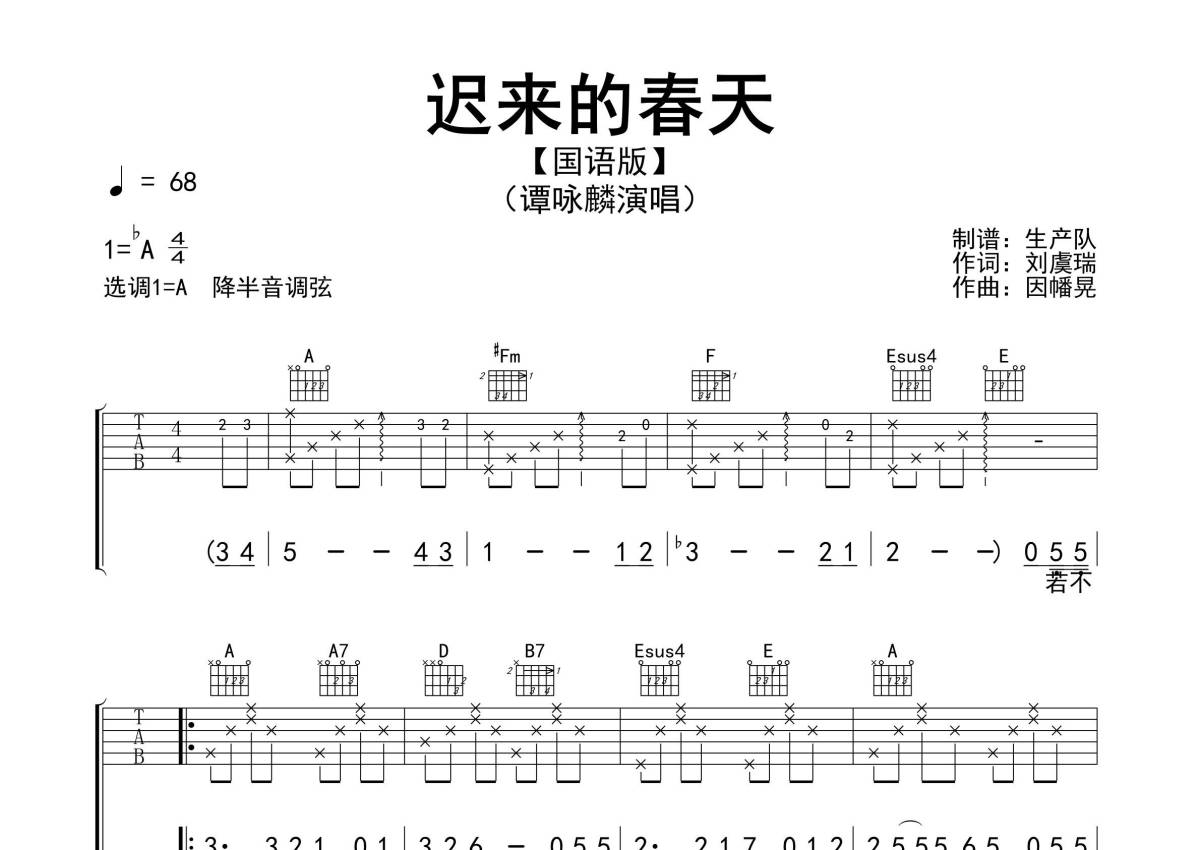 《迟来的春天(国语版)》是国语版演唱的一首歌曲,精编完美版,拍号为4/4拍,歌曲速度为每分钟68拍,歌曲原调为Ab调,但由于原调指法比较难,为了方便弹奏,本吉他谱采用的是A调指法编配,降半音调弦弹奏即为原调,当然也可以根据自己的音域决定是否调弦,这份吉他谱共有两张高清图谱,图谱由 @生产队 编配上传,图谱使用六线谱编配,包含吉他和弦指法、简谱以及歌词部分,使用这份迟来的春天(国语版)吉他谱,可以让你更加方便地掌握这首歌曲的弹唱技巧,快来尝试吧。《迟来的春天》(国语版)是由因幡晃作曲,由刘虞瑞作词,谭咏麟演唱的一首经典歌曲,收录在谭咏麟1991年5月23日由环球唱片发行的普通话专辑《不灭的爱》中。本吉他谱根据原版A调指法编配,完整的前奏、间奏、尾奏编配,怀旧经典!。