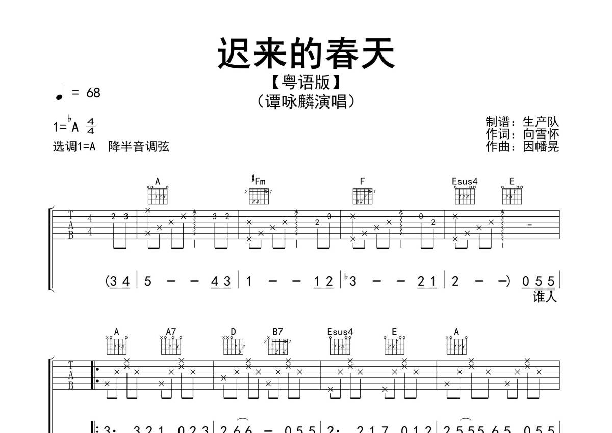 《迟来的春天(粤语版)》是粤语版演唱的一首歌曲,精编完美版,拍号为4/4拍,歌曲速度为每分钟68拍,歌曲原调为Ab调,但由于原调指法比较难,为了方便弹奏,本吉他谱采用的是A调指法编配,降半音调弦弹奏即为原调,当然也可以根据自己的音域决定是否调弦,这份吉他谱共有两张高清图谱,图谱由 @生产队 编配上传,图谱使用六线谱编配,包含吉他和弦指法、简谱以及歌词部分,使用这份迟来的春天(粤语版)吉他谱,可以让你更加方便地掌握这首歌曲的弹唱技巧,快来尝试吧。《迟来的春天》(粤语版)是由因幡晃作曲,由向雪怀作词,谭咏麟演唱的一首经典歌曲,收录在谭咏麟1983年4月19日由环球唱片发行的同名粤语专辑《迟来的春天》中。本吉他谱根据原版A调指法编配,完整的前奏、间奏、尾奏及SOL0编配,怀旧经典!。