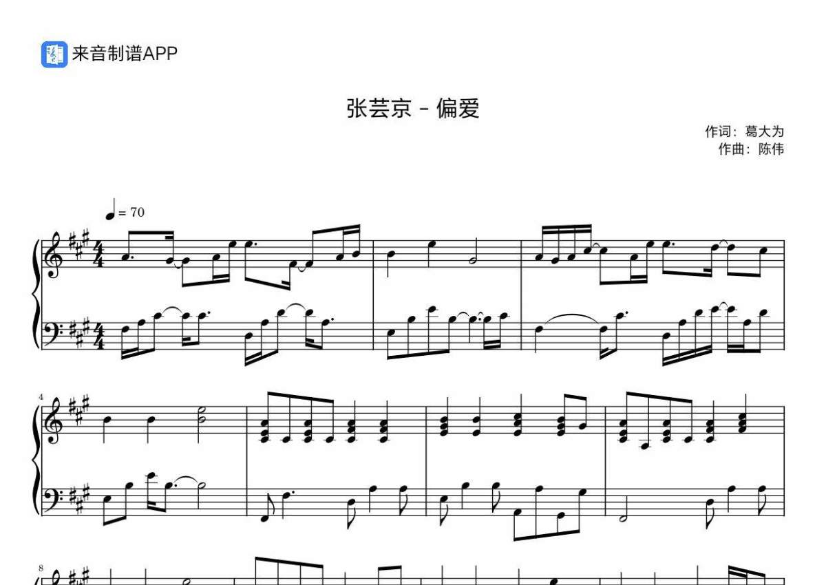《偏爱》是张芸京演唱的一首歌曲,拍号为4/4拍,歌曲速度为每分钟70拍,这份钢琴谱共有四张高清图谱,图谱由 @王皓嵩 编配上传,使用这份偏爱钢琴谱,可以让你更加方便地掌握这首歌曲的弹唱技巧,快来尝试吧。