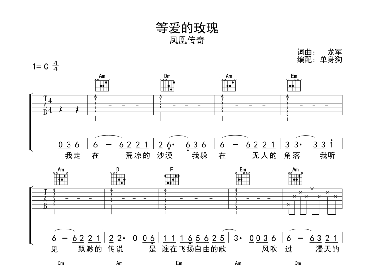 《等爱的玫瑰》是凤凰传奇演唱的一首歌曲,拍号为4/4拍,歌曲原调为C调,本吉他谱采用的是C调指法编配,演奏时不需要使用变调夹即为原调,这份吉他谱共有六张高清图谱,图谱由 @单身狗 编配上传,图谱使用六线谱编配,包含吉他和弦指法、简谱以及歌词部分,使用这份等爱的玫瑰吉他谱,可以让你更加方便地掌握这首歌曲的弹唱技巧,快来尝试吧。