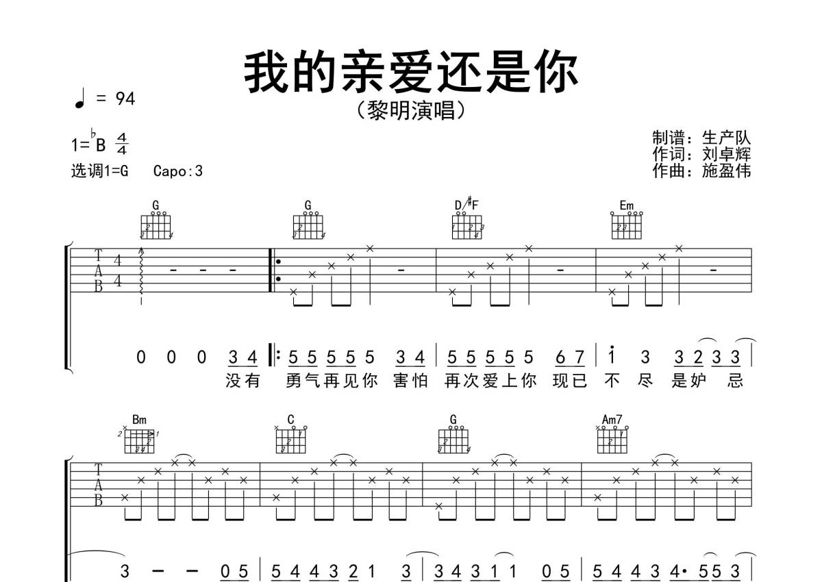 《我的亲爱还是你》是黎明演唱的一首歌曲,精编完美版,拍号为4/4拍,歌曲速度为每分钟94拍,歌曲原调为Bb调,但由于原调指法比较难,为了方便弹奏,本吉他谱采用的是G调指法编配,变调夹3品弹奏即为原调,当然也可以根据自己的音域改变变调夹位置,或者通过改变和弦调性,以方便自己弹奏,这份吉他谱共有三张高清图谱,图谱由 @生产队 编配上传,图谱使用六线谱编配,包含吉他和弦指法、简谱以及歌词部分,使用这份我的亲爱还是你吉他谱,可以让你更加方便地掌握这首歌曲的弹唱技巧,快来尝试吧。《我的亲爱还是你》是黎明演唱的一首粤语歌曲,所属专辑《天地情缘》,该曲国语版是《当你孤单你会想起谁》。本吉他谱根据原版G调指法编配,完整的前奏、间奏、尾奏编配,怀旧经典!。