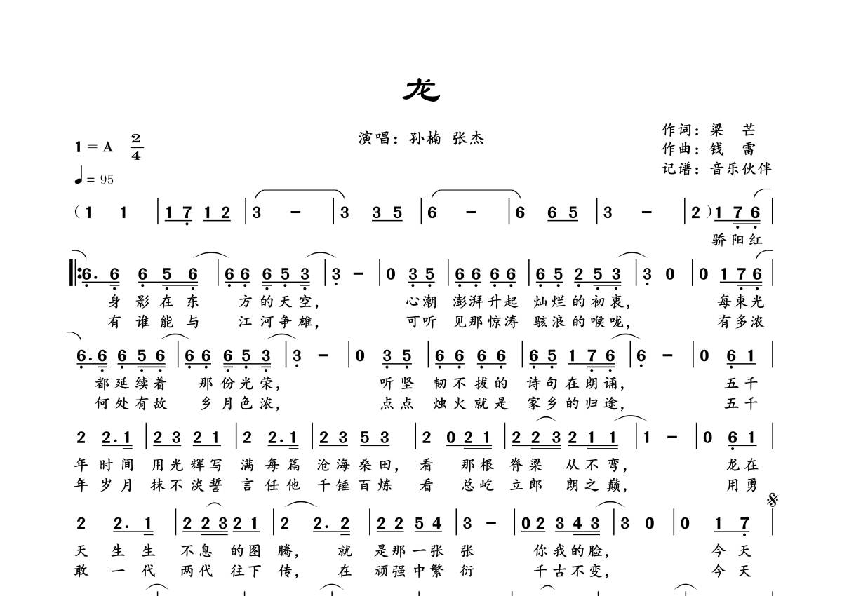 《龙》是孙楠/张杰演唱的一首歌曲,拍号为2/4拍,歌曲速度为每分钟95拍,这份简谱共有一张高清图谱,图谱由 @音乐伙伴 编配上传。