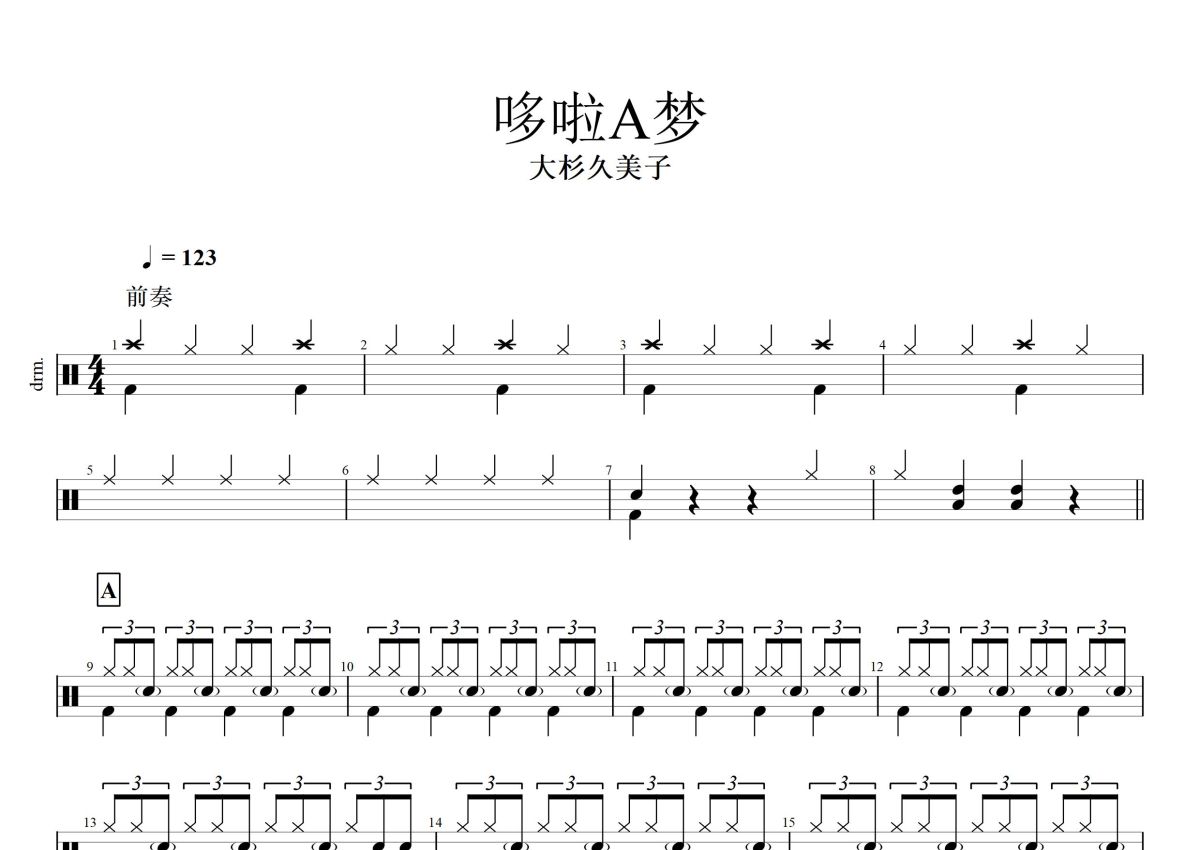 《哆啦A梦》是大杉久美子演唱的一首歌曲,这份鼓谱共有三张高清图谱,图谱由 @打鼓谱 编配上传,图谱使用五线谱编配,使用这份哆啦A梦架子鼓谱,你将能够轻松地敲打出这首大杉久美子的哆啦A梦,快来尝试吧。《哆啦a梦之歌》是《哆啦A梦》使用时间最长的主题曲最初由大杉久美子演唱,是大多数人都会唱的经典歌曲。歌曲很简单,歌词很淳朴,虽然只有三段,每段都很短小,但是歌词中处处流露出孩子的天真无邪。每一段中都有一句说唱,演唱这三句的是大山版哆啦A梦中哆啦A梦的声优------大山羡代。歌曲为严整的四句一段,每段最后都是“アンアンアン,我最喜欢你了,哆啦A梦"。 [1]。