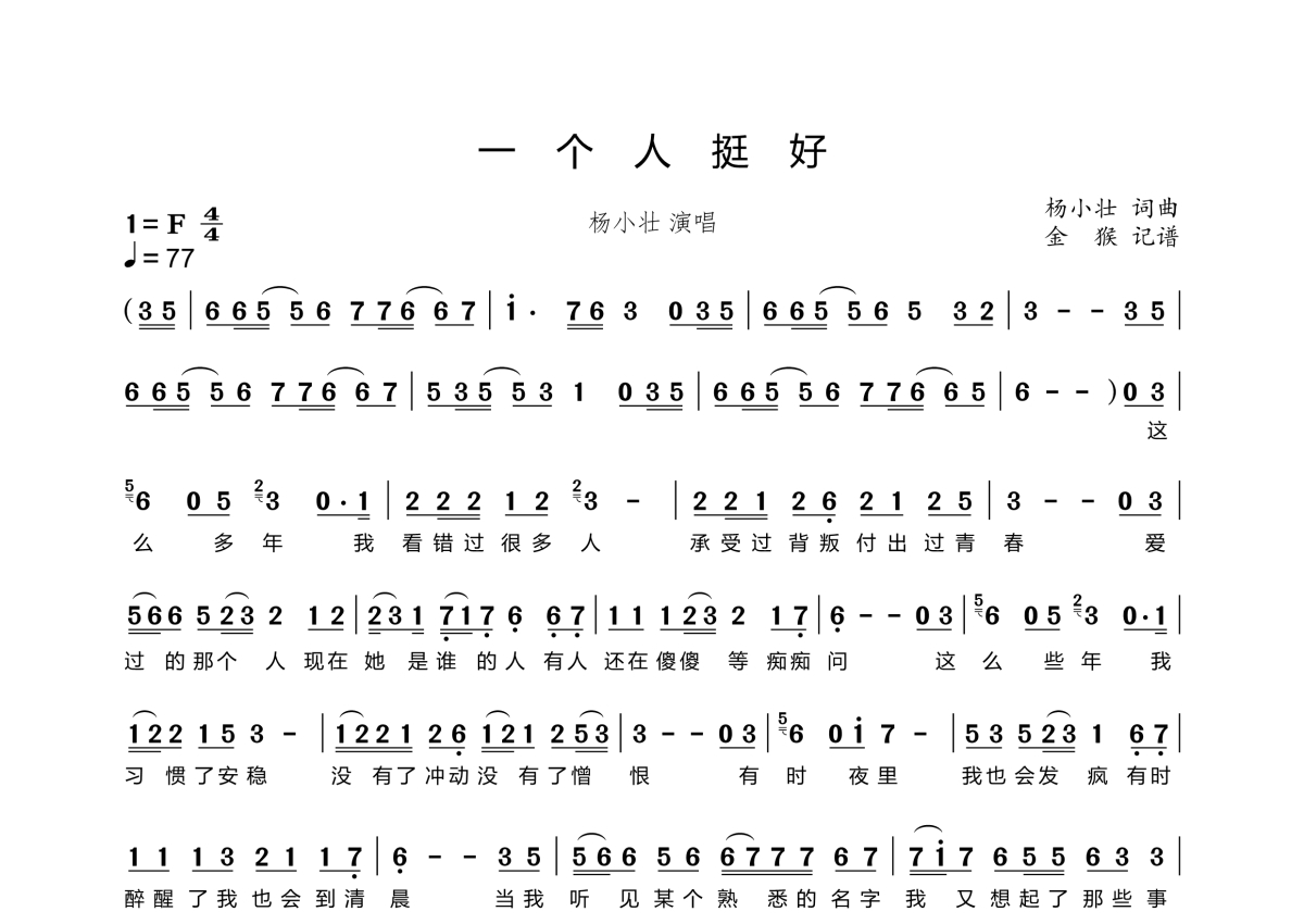 《一个人挺好》是杨小壮演唱的一首歌曲,拍号为4/4拍,歌曲速度为每分钟77拍,这份简谱共有两张高清图谱,图谱由 @金猴奋起千钧棒 编配上传。