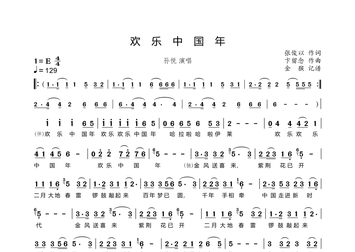 《欢乐中国年》是孙悦演唱的一首歌曲,拍号为4/4拍,歌曲速度为每分钟129拍,这份简谱共有两张高清图谱,图谱由 @金猴奋起千钧棒 编配上传。