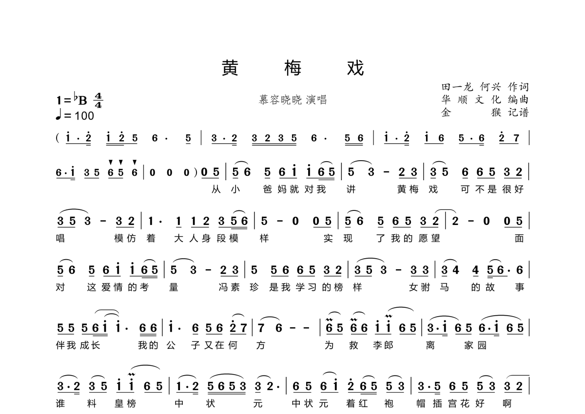 《黄梅戏》是慕容晓晓演唱的一首歌曲,这份简谱共有两张高清图谱,图谱由 @金猴奋起千钧棒 编配上传。