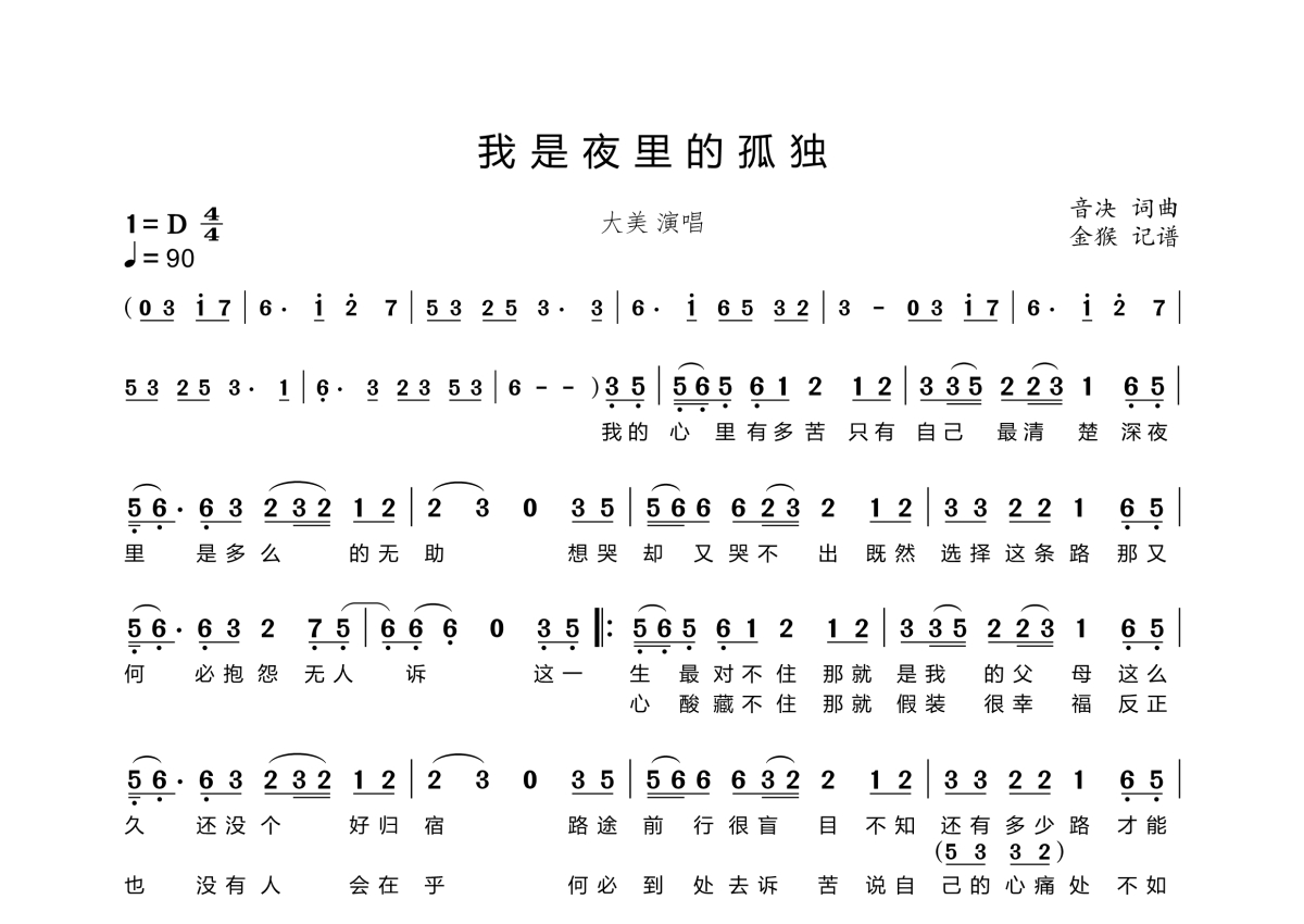 《我是夜里的孤独》是大美演唱的一首歌曲,拍号为4/4拍,歌曲速度为每分钟90拍,这份简谱共有一张高清图谱,图谱由 @金猴奋起千钧棒 编配上传。