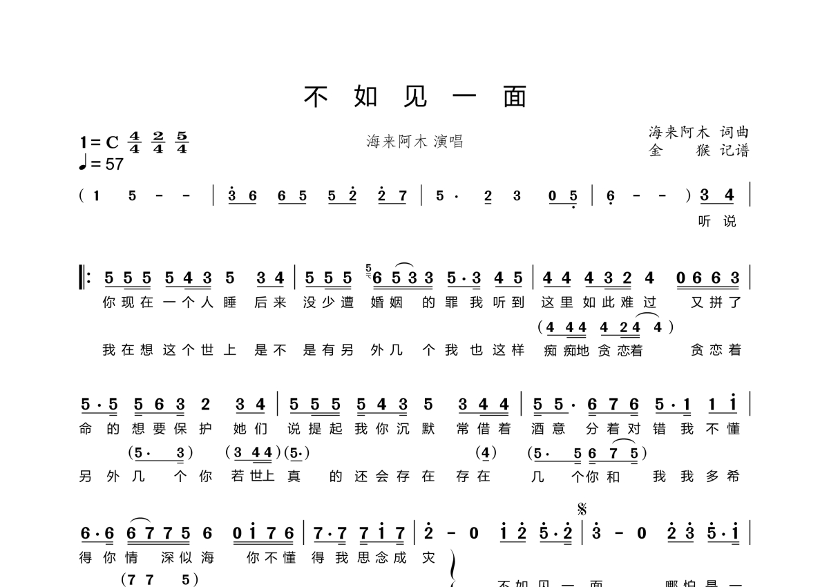 《不如见一面》是海来阿木演唱的一首歌曲,歌曲速度为每分钟57拍,这份简谱共有一张高清图谱,图谱由 @金猴奋起千钧棒 编配上传。