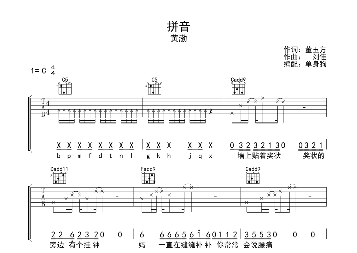 《拼音》吉他谱 - 黄渤 - C调弹唱六线谱