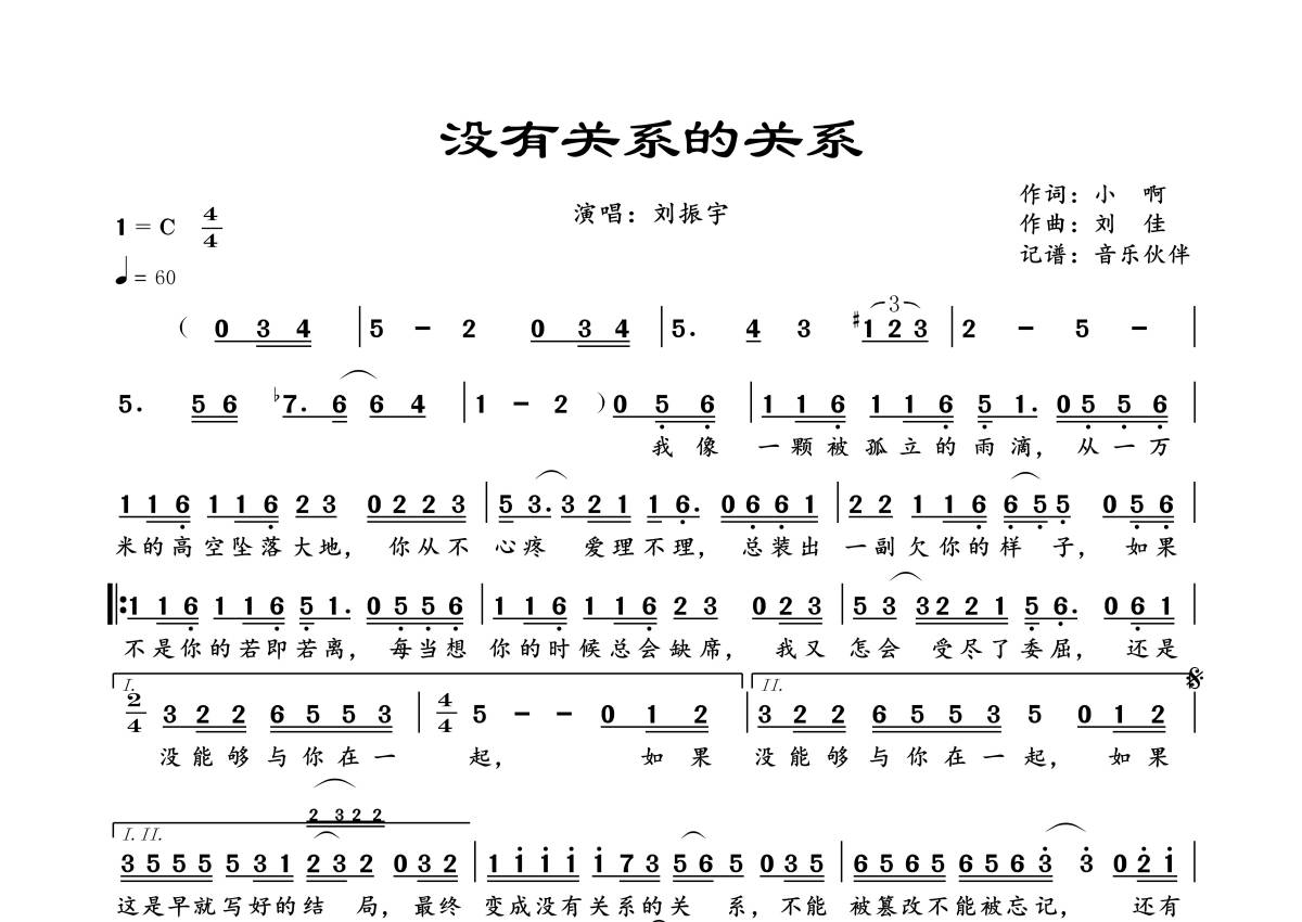 《没有关系的关系》是刘振宇演唱的一首歌曲,拍号为4/4拍,歌曲速度为每分钟60拍,这份简谱共有一张高清图谱,图谱由 @音乐伙伴 编配上传。