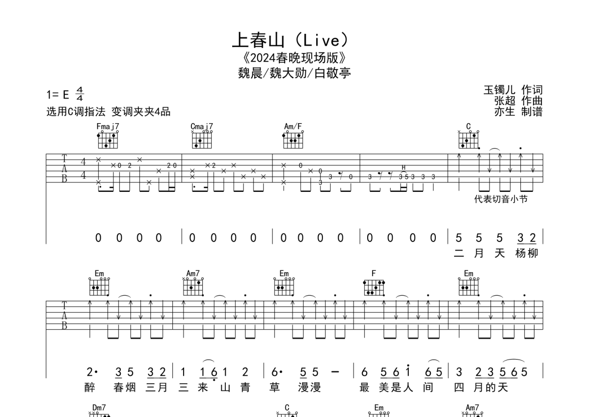 白敬亭/魏大勋/魏晨《上春山》吉他谱 - C调弹唱六线谱