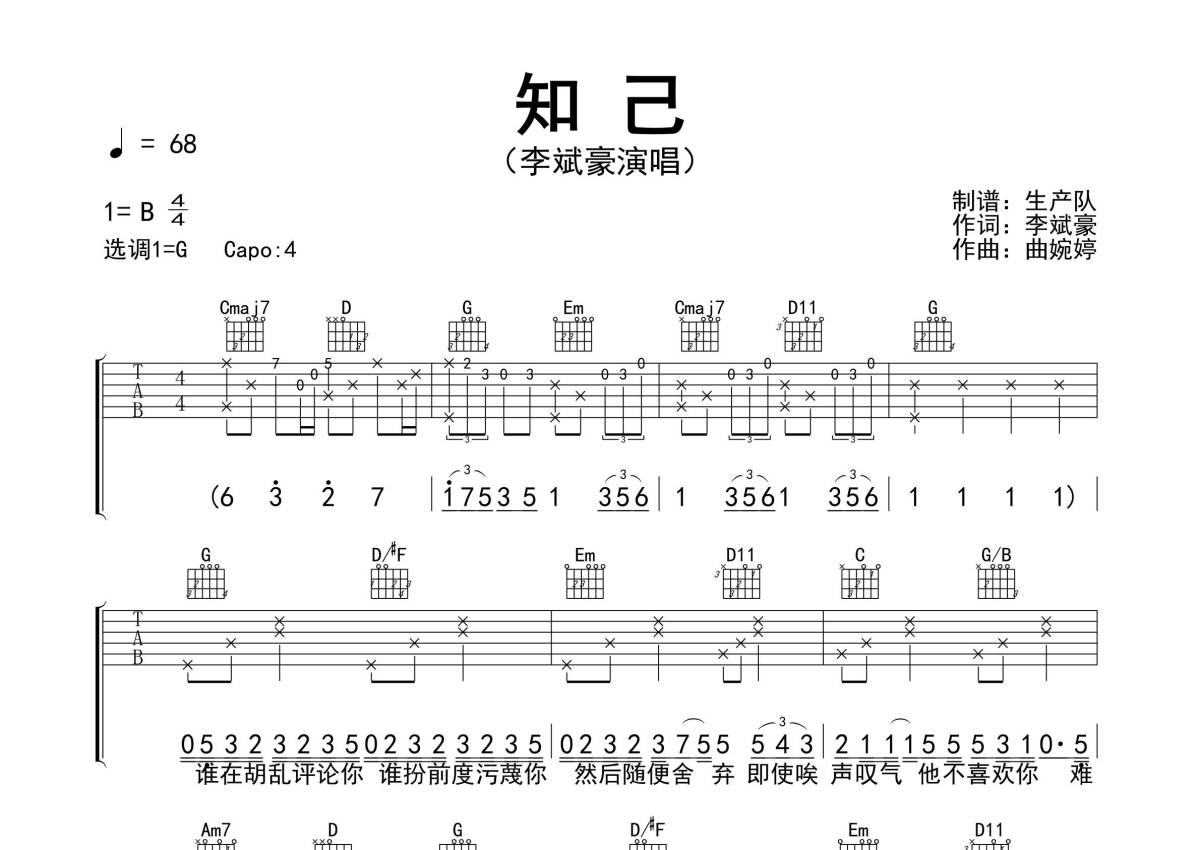 《知己》是李斌豪演唱的一首歌曲,精编完美版,拍号为4/4拍,歌曲速度为每分钟68拍,歌曲原调为B调,但由于原调指法比较难,为了方便弹奏,本吉他谱采用的是G调指法编配,变调夹4品弹奏即为原调,当然也可以根据自己的音域改变变调夹位置,或者通过改变和弦调性,以方便自己弹奏,这份吉他谱共有三张高清图谱,图谱由 @生产队 编配上传,图谱使用六线谱编配,包含吉他和弦指法、简谱以及歌词部分,使用这份知己吉他谱,可以让你更加方便地掌握这首歌曲的弹唱技巧,快来尝试吧。《知己》是李斌豪演唱的一首歌曲,此歌曲也是《我的歌声里》的粤语版。本吉他谱根据原版G调指法编配,完整的前奏、间奏、尾奏编配,怀旧经典!。