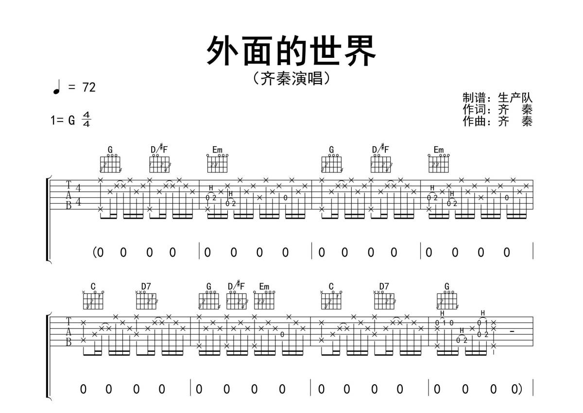 《外面的世界》是齐秦演唱的一首歌曲,精编完美版,拍号为4/4拍,歌曲速度为每分钟72拍,歌曲原调为G调,本吉他谱采用的是G调指法编配,演奏时不需要使用变调夹即为原调,这份吉他谱共有三张高清图谱,图谱由 @生产队 编配上传,图谱使用六线谱编配,包含吉他和弦指法、简谱以及歌词部分,使用这份外面的世界吉他谱,可以让你更加方便地掌握这首歌曲的弹唱技巧,快来尝试吧。《外面的世界》是齐秦作词、作曲并演唱的一首经典歌曲,收录在齐秦1987年2月18日发行的专辑《冬雨》中。本吉他谱根据原版G调指法编配,精准的前奏、间奏、尾奏及SOLO编配,怀旧经典!。