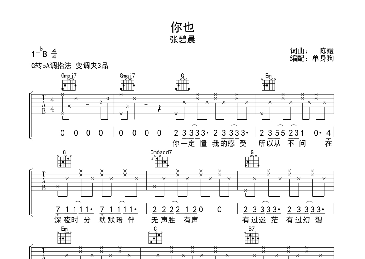 《你也》是张碧晨演唱的一首歌曲,拍号为4/4拍,歌曲原调为Bb调,但由于原调指法比较难,为了方便弹奏,本吉他谱采用的是G调指法编配,变调夹3品弹奏即为原调,当然也可以根据自己的音域改变变调夹位置,或者通过改变和弦调性,以方便自己弹奏,这份吉他谱共有三张高清图谱,图谱由 @单身狗 编配上传,图谱使用六线谱编配,包含吉他和弦指法、简谱以及歌词部分,使用这份你也吉他谱,可以让你更加方便地掌握这首歌曲的弹唱技巧,快来尝试吧。