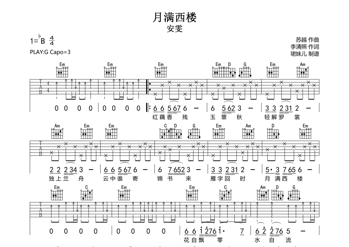 《月满西楼》是安雯演唱的一首歌曲,拍号为4/4拍,歌曲速度为每分钟85拍,歌曲原调为G调,本吉他谱采用的是G调指法编配,变调夹3品弹奏即为原调,当然也可以根据自己的音域改变变调夹位置,或者通过改变和弦调性,以方便自己弹奏,这份吉他谱共有一张高清图谱,图谱由 @珺妹儿 编配上传,图谱使用六线谱编配,包含吉他和弦指法、简谱以及歌词部分,使用这份月满西楼吉他谱,可以让你更加方便地掌握这首歌曲的弹唱技巧,快来尝试吧。