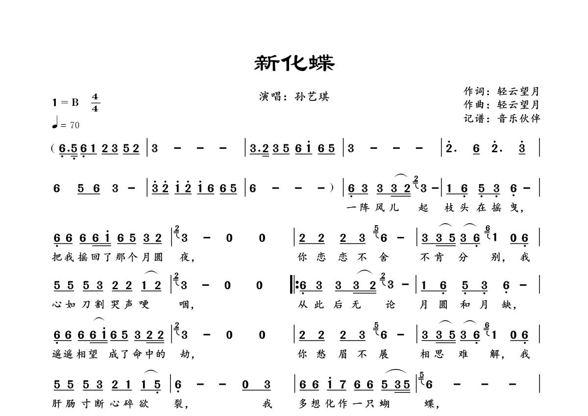 《新化蝶》是孙艺琪演唱的一首歌曲,拍号为4/4拍,歌曲速度为每分钟70拍,这份简谱共有一张高清图谱,图谱由 @音乐伙伴 编配上传。