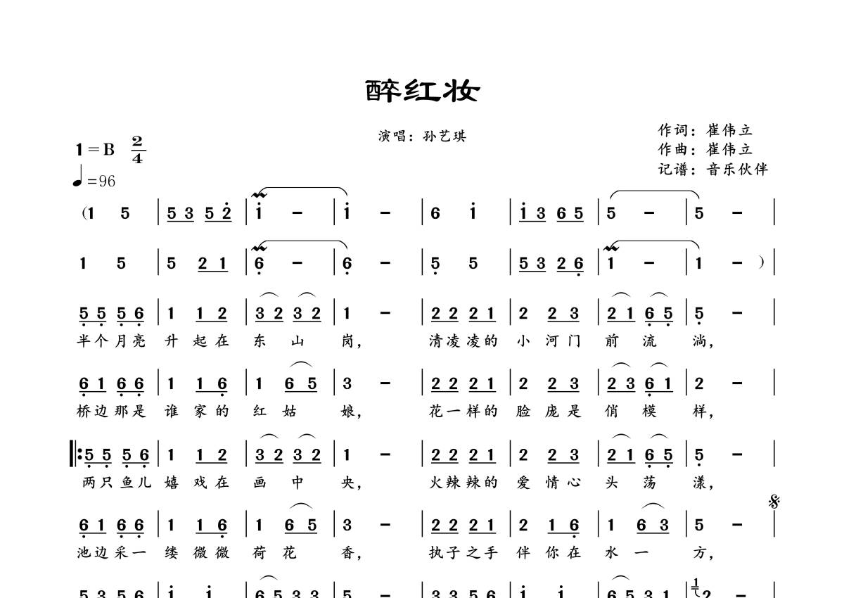 《醉红妆》是孙艺琪演唱的一首歌曲,拍号为2/4拍,歌曲速度为每分钟96拍,这份简谱共有一张高清图谱,图谱由 @音乐伙伴 编配上传。