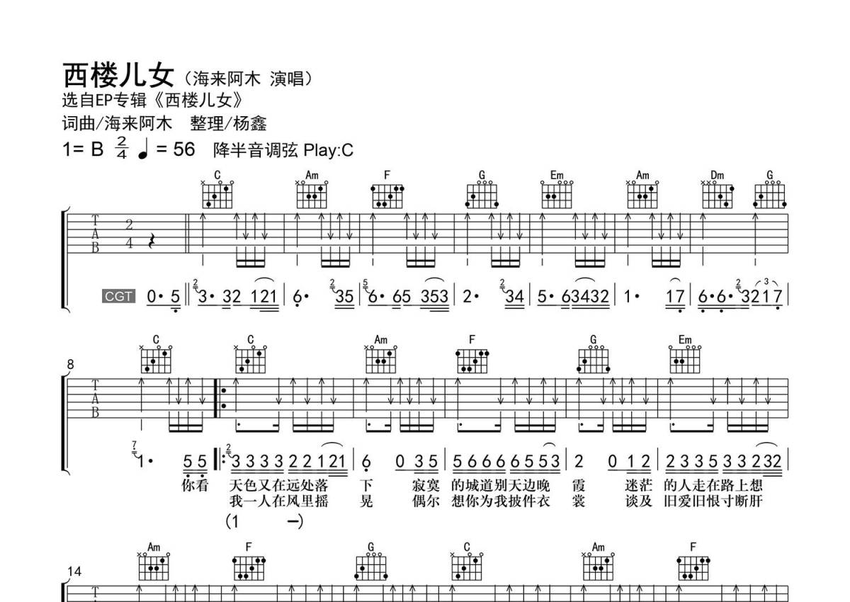 《西楼儿女》是海来阿木演唱的一首歌曲,简化版,拍号为4/4拍,歌曲速度为每分钟56拍,歌曲原调为B调,但由于原调指法比较难,为了方便弹奏,本吉他谱采用的是C调指法编配,降半音调弦弹奏即为原调,当然也可以根据自己的音域决定是否调弦,这份吉他谱共有两张高清图谱,图谱由 @老杨教吉他 编配上传,图谱使用六线谱编配,包含吉他和弦指法、简谱以及歌词部分,使用这份西楼儿女吉他谱,可以让你更加方便地掌握这首歌曲的弹唱技巧,快来尝试吧。【调弦】降半音调弦。 【编配情况】根据原曲精细整理。 【和弦难度】大横按和弦。 【节奏难度】最小时值16分音符,含附点、切分节奏。 【难点】无。 【技巧说明】空心圈为【哑音】。