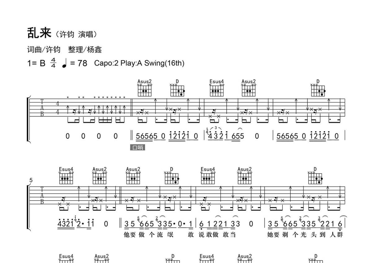 《乱来》是许钧演唱的一首歌曲,精编弹唱,拍号为4/4拍,歌曲速度为每分钟78拍,歌曲原调为B调,但由于原调指法比较难,为了方便弹奏,本吉他谱采用的是A调指法编配,变调夹2品弹奏即为原调,当然也可以根据自己的音域改变变调夹位置,或者通过改变和弦调性,以方便自己弹奏,这份吉他谱共有四张高清图谱,图谱由 @老杨教吉他 编配上传,图谱使用六线谱编配,包含吉他和弦指法、简谱以及歌词部分,使用这份乱来吉他谱,可以让你更加方便地掌握这首歌曲的弹唱技巧,快来尝试吧。【调弦】标准调弦。 【和弦难度】少量不常用和弦、大横按和弦。 【节奏难度】最小时值16分音符三连音,含敲板、哑音、拍弦等技巧,含切分、附点节奏,Swing律动。 【难点】Swing律动,节奏的变化及技巧的应用(歌曲提供了两种基本节奏,可以统一为自己喜欢的一种来伴奏即可)。 【技巧说明】空心圈为【哑音】;拨弦带框为【拍弦】(高音弦未带框的用食指与中指“扫”弦;78小节中的拍弦为左手拍弦);H为【击弦】;标注“+”为【敲板】(扫弦带+为中指与食指向下扫弦,同时用掌根敲击音孔上方面板;连续3个三弦拨弦带+为无名指-中指-食指依次敲击1弦下方面板;2弦拨弦带+为拇指外侧敲击1弦下方面板;1弦拨弦带+为食指、中指与无名指同时敲击吉他下后方侧板)。