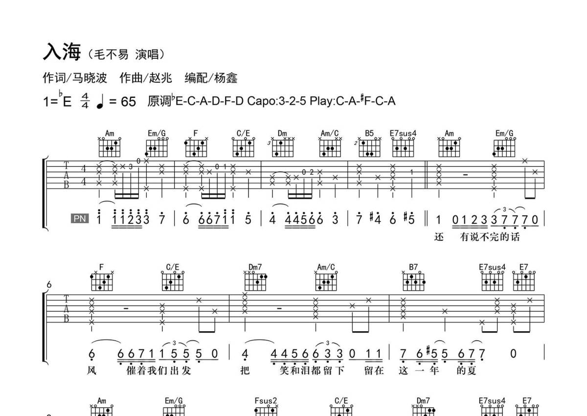 《入海》是毛不易演唱的一首歌曲,精编弹唱,拍号为4/4拍,歌曲速度为每分钟65拍,歌曲原调为Eb调,但由于原调指法比较难,为了方便弹奏,本吉他谱采用的是C调指法编配,变调夹3品弹奏即为原调,当然也可以根据自己的音域改变变调夹位置,或者通过改变和弦调性,以方便自己弹奏,这份吉他谱共有五张高清图谱,图谱由 @老杨教吉他 编配上传,图谱使用六线谱编配,包含吉他和弦指法、简谱以及歌词部分,使用这份入海吉他谱,可以让你更加方便地掌握这首歌曲的弹唱技巧,快来尝试吧。视频演示>>>>>>https://www.bilibili.com/video/BV1dX4y147pV/ 【调弦】标准调弦。 【基本信息】原曲bE转C转A转D转F转D调,选调C转A转#F转C转A调,变调夹夹3转2转5品,每分钟65拍。 【编配情况】根据原曲精细整理。 【和弦难度】和弦的特殊按法、不常用和弦、大跨度和弦、大横按、吉他技巧。 【节奏难度】最小时值32分音符,含附点、切分、弱起节奏。 【难点】和弦应用较多,注意节奏的变化;第一次移动变调夹时时间比较短,可省略一两拍。 【技巧说明】拨弦后带斜杠为【无尾滑音】;拨弦带“+”为敲板(3弦拨弦带“+”为拇指敲击琴码下后方面板;2弦拨弦带“+”为中指与无名指敲击吉他下后方侧板)。