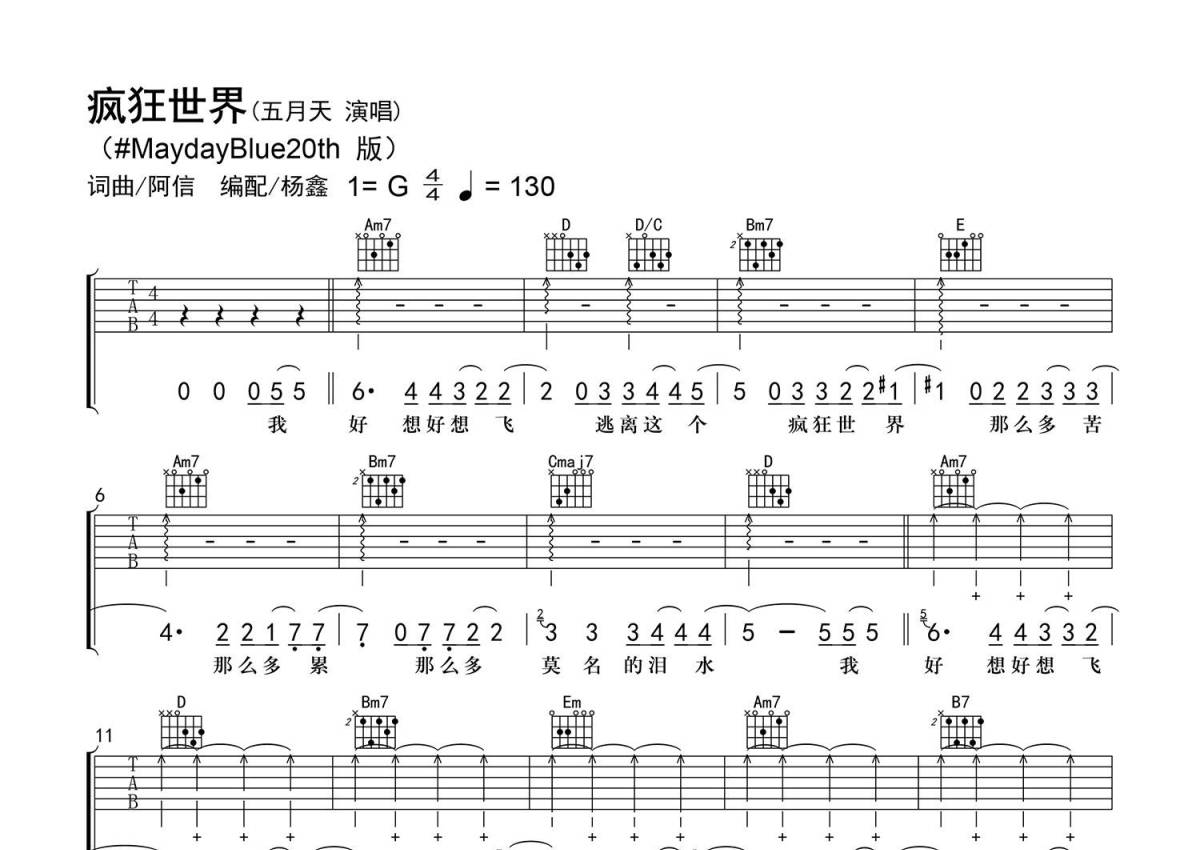 《疯狂世界》是五月天演唱的一首歌曲,精编弹唱,拍号为4/4拍,歌曲速度为每分钟130拍,歌曲原调为G调,本吉他谱采用的是G调指法编配,演奏时不需要使用变调夹即为原调,这份吉他谱共有四张高清图谱,图谱由 @老杨教吉他 编配上传,图谱使用六线谱编配,包含吉他和弦指法、简谱以及歌词部分,使用这份疯狂世界吉他谱,可以让你更加方便地掌握这首歌曲的弹唱技巧,快来尝试吧。【调弦】标准调弦。 【基本信息】原曲G调,选调G,每分钟130拍。 【编配情况】根据原曲精细整理。 【和弦难度】和弦的特殊按法、大横按和弦、大跨度按弦。 【节奏难度】最小时值16分音符,含附点、切分节奏,哑音、闷音、敲板等技巧。 【难点】节奏的多样化/吉他技巧。 【技巧说明】“+”为【敲板】(掌根敲击琴码下后方面板,模仿大鼓声音);标注“M”为【闷音】;空心圈为【哑音】;拨弦后带斜杠为【无尾滑音】。