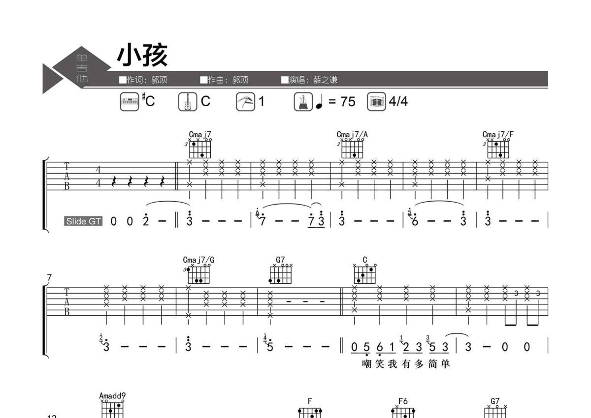 《小孩》是薛之谦演唱的一首歌曲,精编弹唱,拍号为4/4拍,歌曲速度为每分钟75拍,歌曲原调为Db调,但由于原调指法比较难,为了方便弹奏,本吉他谱采用的是C调指法编配,变调夹1品弹奏即为原调,当然也可以根据自己的音域改变变调夹位置,或者通过改变和弦调性,以方便自己弹奏,这份吉他谱共有四张高清图谱,图谱由 @老杨教吉他 编配上传,图谱使用六线谱编配,包含吉他和弦指法、简谱以及歌词部分,使用这份小孩吉他谱,可以让你更加方便地掌握这首歌曲的弹唱技巧,快来尝试吧。【调弦】标准调弦。 【基本信息】原曲#C调,选调C,变调夹夹1品,每分钟75拍。 【编配情况】根据原曲精细整理。 【和弦难度】和弦的特殊按法、不常用和弦、大跨度和弦、大横按。 【节奏难度】最小时值16分音符,含少量切分节奏。 【难点】和弦的按法与快速转换/和弦中的过渡音。 【技巧说明】P为【勾弦】。