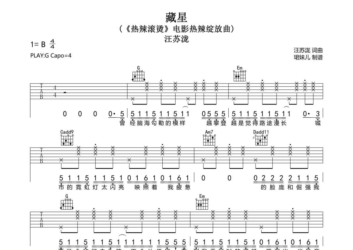 汪苏泷《藏星》吉他谱 - G调弹唱六线谱