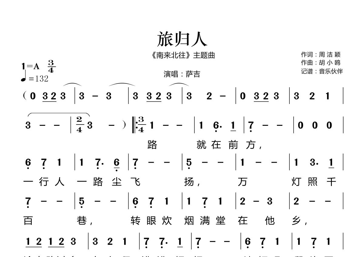 《旅归人》是萨吉演唱的一首歌曲,这份简谱共有两张高清图谱,图谱由 @音乐伙伴 编配上传《南来北往》电视剧主题曲。
