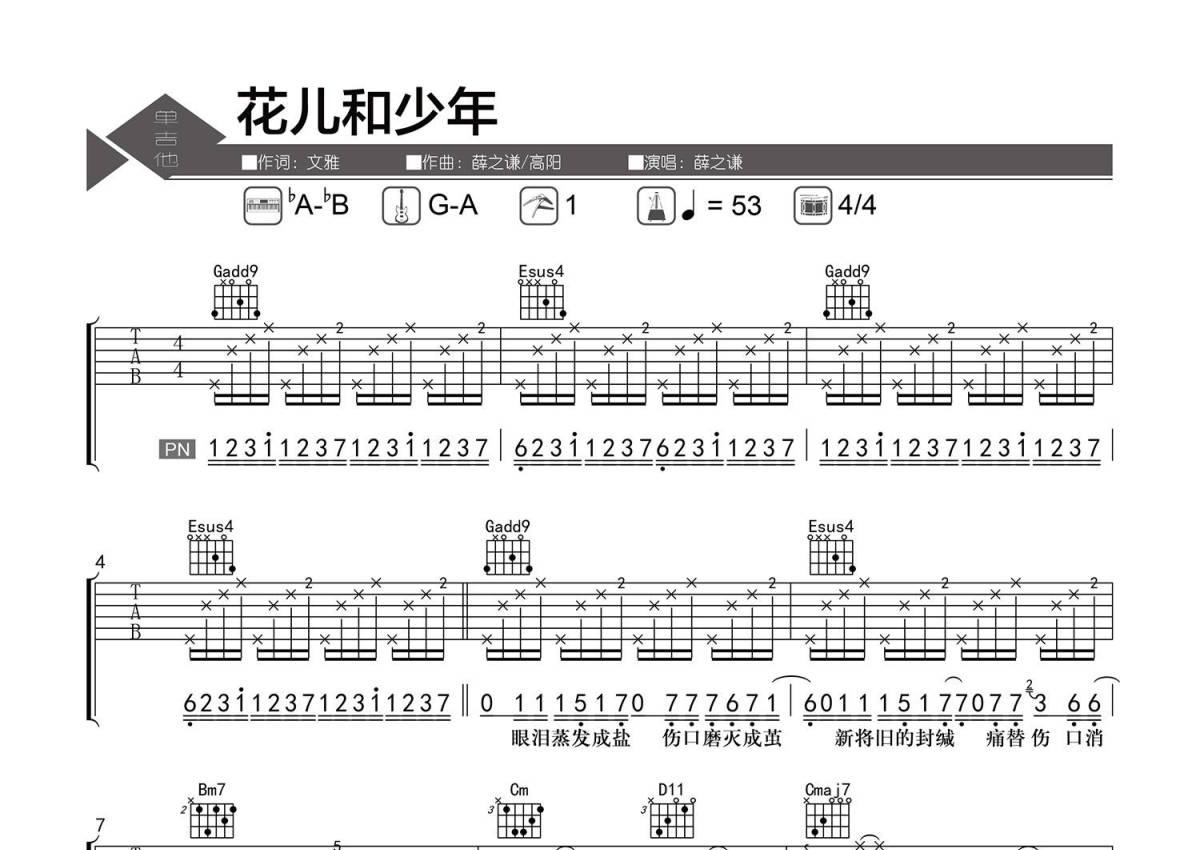 《花儿和少年》是薛之谦演唱的一首歌曲,精编弹唱,拍号为4/4拍,歌曲速度为每分钟53拍,歌曲原调为Ab调,但由于原调指法比较难,为了方便弹奏,本吉他谱采用的是G调指法编配,变调夹1品弹奏即为原调,当然也可以根据自己的音域改变变调夹位置,或者通过改变和弦调性,以方便自己弹奏,这份吉他谱共有三张高清图谱,图谱由 @老杨教吉他 编配上传,图谱使用六线谱编配,包含吉他和弦指法、简谱以及歌词部分,使用这份花儿和少年吉他谱,可以让你更加方便地掌握这首歌曲的弹唱技巧,快来尝试吧。【调弦】标准调弦。 【编配情况】根据原曲精细整理。 【和弦难度】和弦的特殊按法、不常用和弦、大横按。 【节奏难度】最小时值32分音符,含切少量切分节奏,含少量哑音与滑音技巧。 【难点】和弦的快速转换/弹奏的连贯性/节奏的变化。 【技巧说明】空心圈为【哑音】;拨弦后加斜杠为【无尾滑音】。