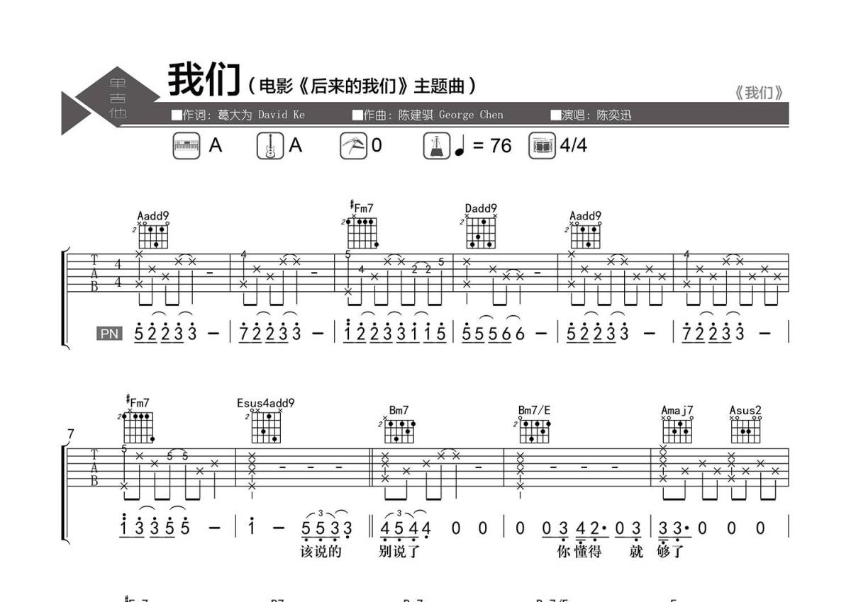 《我们》是陈奕迅演唱的一首歌曲,精编弹唱,拍号为4/4拍,歌曲速度为每分钟76拍,歌曲原调为A调,但由于原调指法比较难,为了方便弹奏,本吉他谱采用的是A调指法编配,演奏时不需要使用变调夹即为原调,这份吉他谱共有三张高清图谱,图谱由 @老杨教吉他 编配上传,图谱使用六线谱编配,包含吉他和弦指法、简谱以及歌词部分,曲谱配备了相关的视频提供浏览,使用这份我们吉他谱,可以让你更加方便地掌握这首歌曲的弹唱技巧,快来尝试吧。【调弦】标准调弦。 【编配情况】根据原曲精细整理。 【和弦难度】和弦的特殊按法、不常用和弦、大跨度和弦、大横按。 【节奏难度】最小时值16分音符,含切分节奏。 【难点】不常用和弦与和弦的特殊按法,前奏与间奏的指法安排,节奏的变化。 【技巧说明】P为【勾弦】。 视频演示>>>>>>https://www.bilibili.com/video/BV1jt411a7ri/ 讲解视频>>>>>>https://www.bilibili.com/video/BV1Xt41187Wm/。