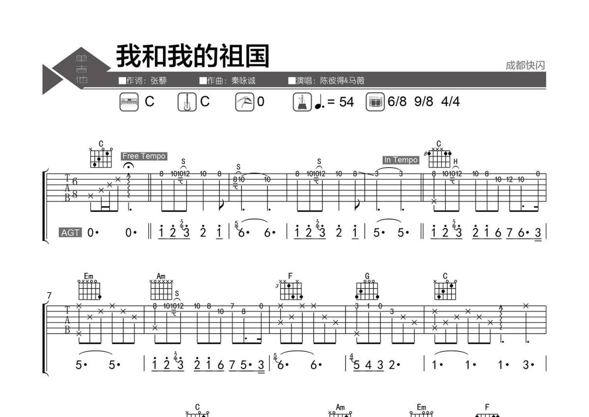 《我和我的祖国》是陈彼得演唱的一首歌曲,精编弹唱,拍号为6/8拍,歌曲速度为每分钟54拍,歌曲原调为C调,本吉他谱采用的是C调指法编配,演奏时不需要使用变调夹即为原调,这份吉他谱共有四张高清图谱,图谱由 @老杨教吉他 编配上传,图谱使用六线谱编配,包含吉他和弦指法、简谱以及歌词部分,使用这份我和我的祖国吉他谱,可以让你更加方便地掌握这首歌曲的弹唱技巧,快来尝试吧。【调弦】标准调弦。 【基本信息】原曲C调,选调C,6/8、9/8、4/4混合拍,每分钟54拍(说唱部分变速)。 【编配情况】根据原曲精细整理(含说唱部分)。 【和弦难度】和弦的特殊按法、大跨度和弦、大横按和弦。 【节奏难度】最小时值16分音符,注意三连音律动。 【难点】前奏的指法安排,三连音的律动,切分、弱起节奏与哑音技巧。 【技巧说明】H为【击弦】、S为【滑音】;两音之间带斜杠为【滑奏】;空心圈为【哑音】;后加斜杠为【无尾滑音】。 视频演示>>>>>>https://www.bilibili.com/video/BV1Q4411L7kN/ 讲解视频>>>>>>https://www.bilibili.com/video/BV1E4411N7Dm/。