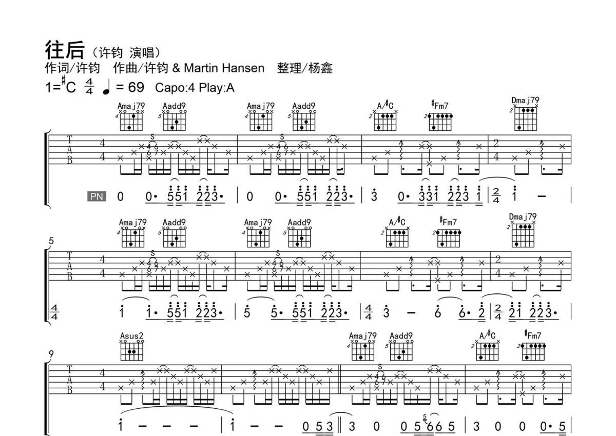 《往后》是许钧演唱的一首歌曲,精编弹唱,拍号为4/4拍,歌曲速度为每分钟60拍,歌曲原调为Db调,但由于原调指法比较难,为了方便弹奏,本吉他谱采用的是A调指法编配,变调夹4品弹奏即为原调,当然也可以根据自己的音域改变变调夹位置,或者通过改变和弦调性,以方便自己弹奏,这份吉他谱共有三张高清图谱,图谱由 @老杨教吉他 编配上传,图谱使用六线谱编配,包含吉他和弦指法、简谱以及歌词部分,使用这份往后吉他谱,可以让你更加方便地掌握这首歌曲的弹唱技巧,快来尝试吧。【调弦】标准调弦。 【编配情况】根据原曲精细整理。 【和弦难度】和弦的特殊按法、不常用和弦、大跨度按弦、大横按。 【节奏难度】最小时值32分音符,含大量附点、切分节奏,含少量击弦与滑音技巧。 【难点】节奏的变化,和弦的快速转换。 【技巧说明】S为【滑音】、H为【击弦】。