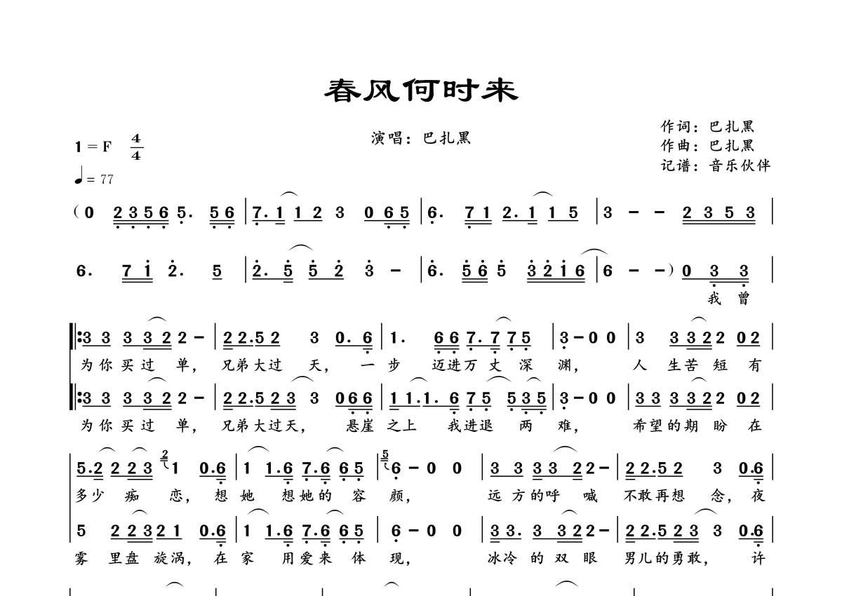 《春风何时来》是巴扎黑演唱的一首歌曲,拍号为4/4拍,歌曲速度为每分钟77拍,这份简谱共有一张高清图谱,图谱由 @音乐伙伴 编配上传。