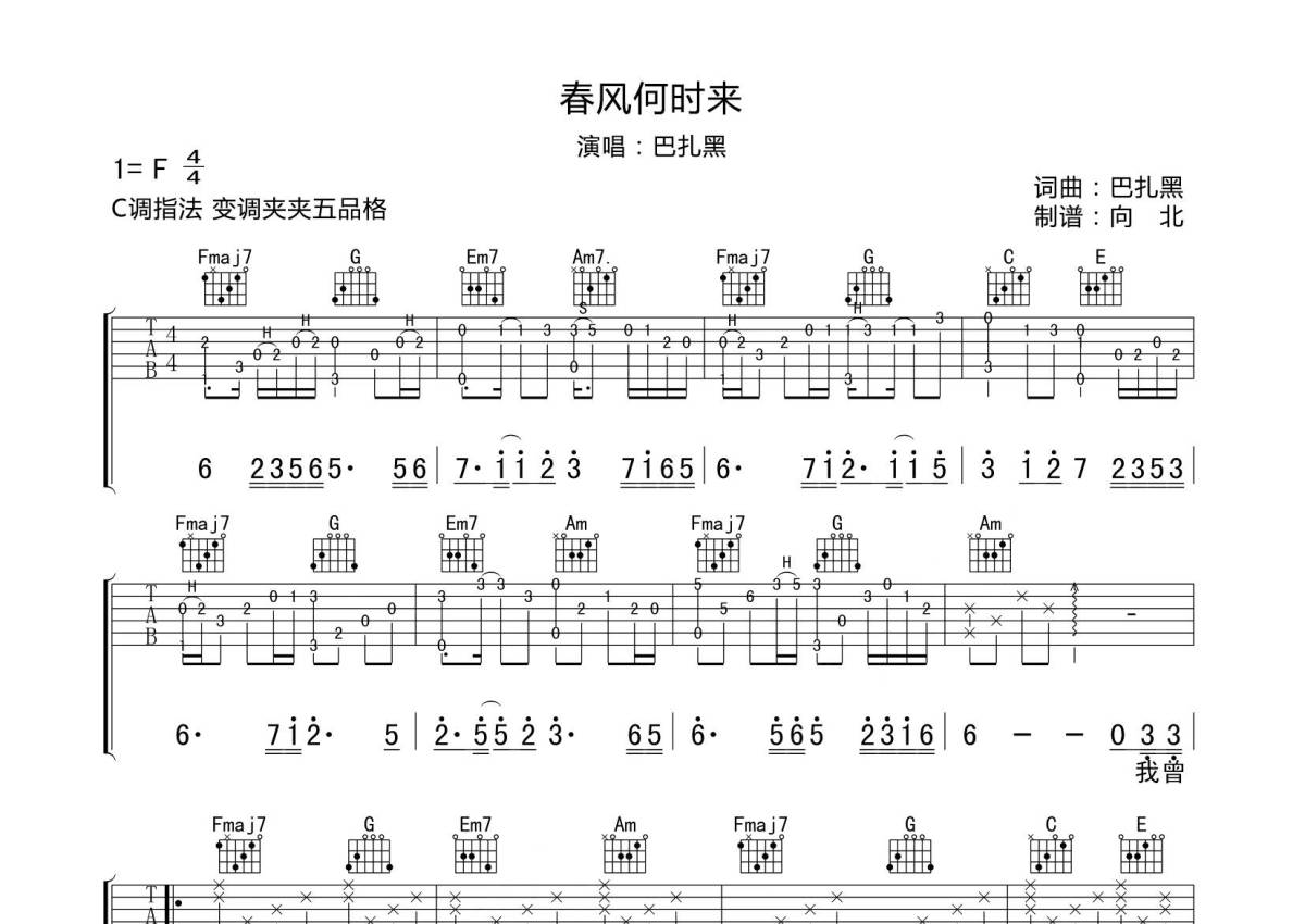 巴扎黑《春风何时来》吉他谱 - C调弹唱六线谱 - 专辑版