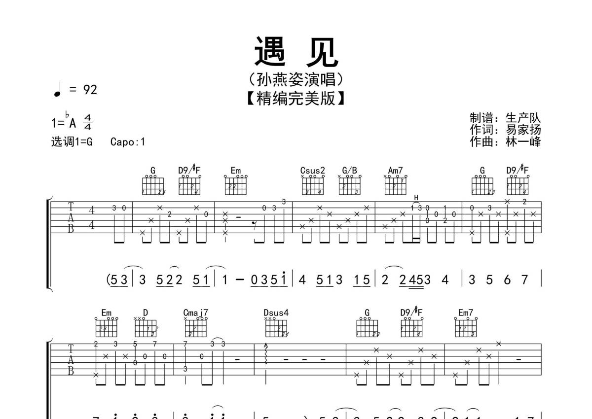 《遇见》是孙燕姿演唱的一首歌曲,精编完美版,拍号为4/4拍,歌曲速度为每分钟92拍,歌曲原调为Ab调,但由于原调指法比较难,为了方便弹奏,本吉他谱采用的是G调指法编配,变调夹1品弹奏即为原调,当然也可以根据自己的音域改变变调夹位置,或者通过改变和弦调性,以方便自己弹奏,这份吉他谱共有三张高清图谱,图谱由 @生产队 编配上传,图谱使用六线谱编配,包含吉他和弦指法、简谱以及歌词部分,使用这份遇见吉他谱,可以让你更加方便地掌握这首歌曲的弹唱技巧,快来尝试吧。《遇见》是电影《向左走,向右走》的主题曲,由易家扬作词,林一峰作曲,孙燕姿演唱,收录在孙燕姿2003年8月22日由华纳唱片发行的《The Moment》专辑中。本吉他谱根据原版G调指法编配,完整的前奏、间奏、尾奏和SOLO编配,怀旧经典!。