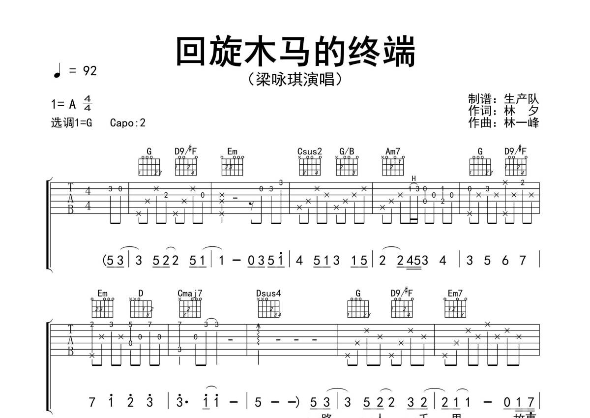 《回旋木马的终端》是梁咏琪演唱的一首歌曲,精编完美版,拍号为4/4拍,歌曲速度为每分钟92拍,歌曲原调为A调,但由于原调指法比较难,为了方便弹奏,本吉他谱采用的是G调指法编配,变调夹2品弹奏即为原调,当然也可以根据自己的音域改变变调夹位置,或者通过改变和弦调性,以方便自己弹奏,这份吉他谱共有三张高清图谱,图谱由 @生产队 编配上传,图谱使用六线谱编配,包含吉他和弦指法、简谱以及歌词部分,使用这份回旋木马的终端吉他谱,可以让你更加方便地掌握这首歌曲的弹唱技巧,快来尝试吧。《回旋木马的终端》是梁咏琪演唱的一首经典歌曲,收录在专辑《向左走向右走》中。本吉他谱根据原版G调指法编配,完整的前奏、间奏、尾奏和SOLO编配,精编完美版,怀旧经典!。