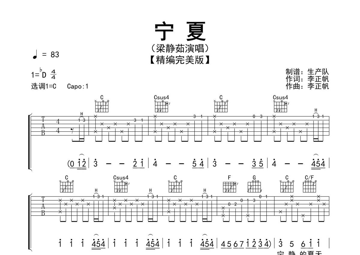 《宁夏》是梁静茹演唱的一首歌曲,精编完美版,拍号为4/4拍,歌曲速度为每分钟83拍,歌曲原调为Db调,但由于原调指法比较难,为了方便弹奏,本吉他谱采用的是C调指法编配,变调夹1品弹奏即为原调,当然也可以根据自己的音域改变变调夹位置,或者通过改变和弦调性,以方便自己弹奏,这份吉他谱共有三张高清图谱,图谱由 @生产队 编配上传,图谱使用六线谱编配,包含吉他和弦指法、简谱以及歌词部分,使用这份宁夏吉他谱,可以让你更加方便地掌握这首歌曲的弹唱技巧,快来尝试吧。《宁夏》是一首由李正帆作词、作曲,梁静茹演唱的经典歌曲,收录于梁静茹2004年9月10日由滚石唱片发行的专辑《燕尾蝶 下定爱的决心》中 。本吉他谱根据原版C调指法编配,完整的前奏、间奏、尾奏编配,精编完美版,怀旧经典!。