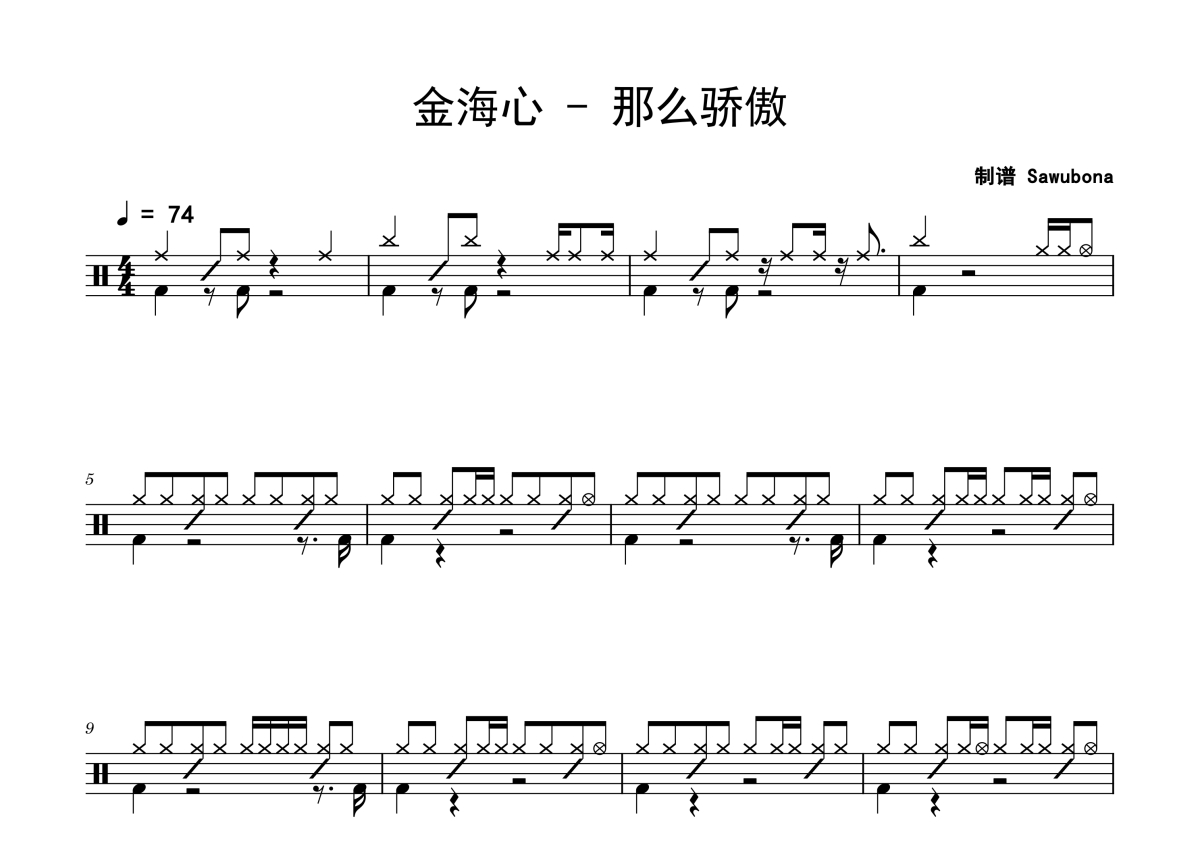 《那么骄傲》是金海心演唱的一首歌曲,拍号为4/4拍,歌曲速度为每分钟74拍,这份架子鼓谱共有三张高清图谱,图谱由 @Sawubona 编配上传,图谱使用五线谱编配,使用这份那么骄傲架子鼓谱,你将能够轻松地敲打出这首金海心的那么骄傲,快来尝试吧。