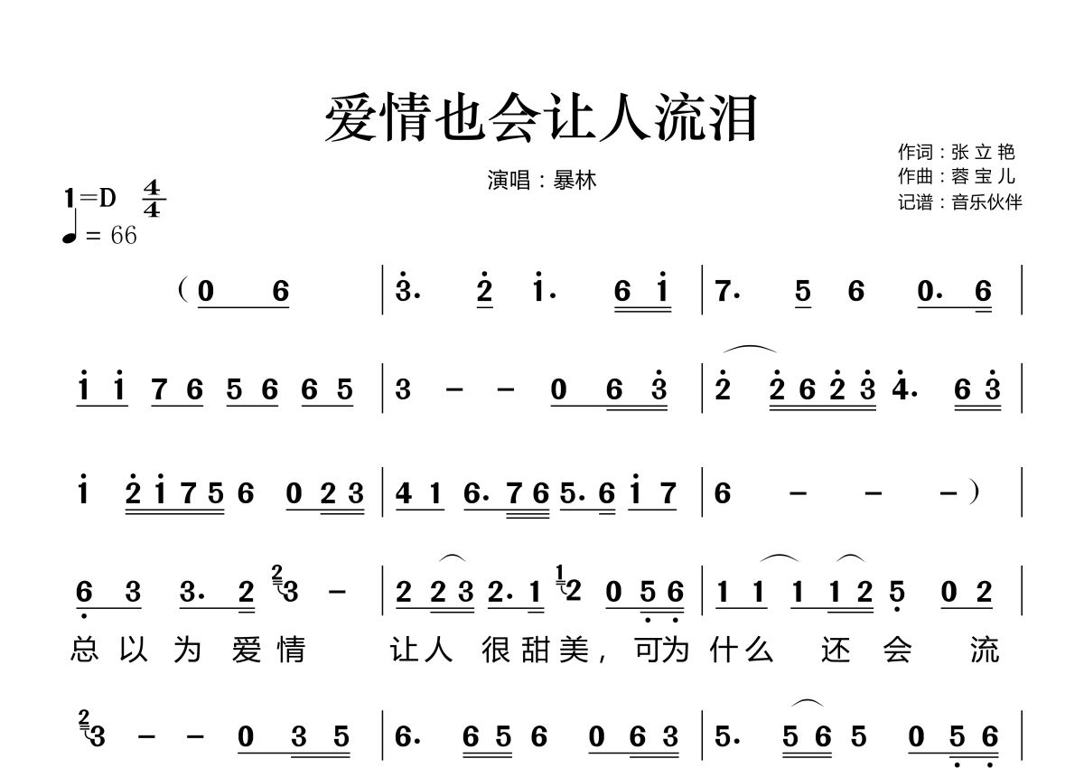 爱情也会让人流泪简谱 - 暴林演唱