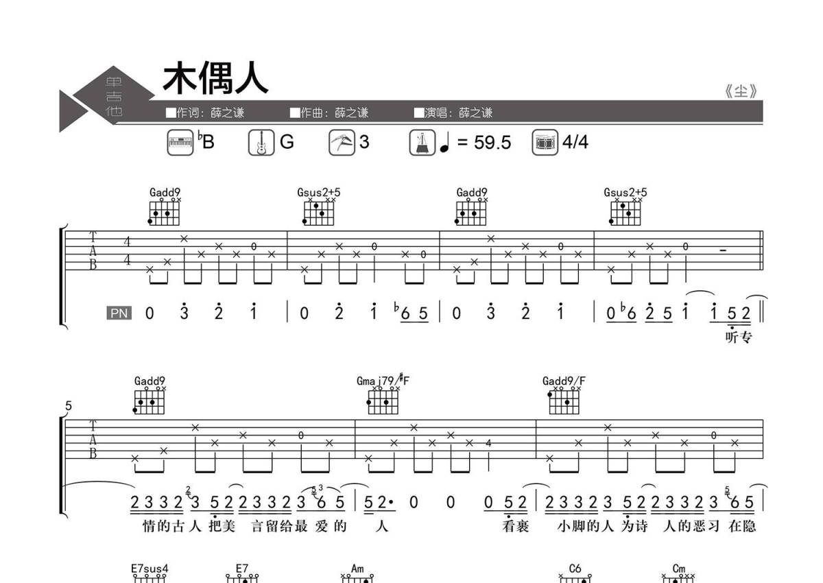 《木偶人》是薛之谦演唱的一首歌曲,精编弹唱,拍号为4/4拍,歌曲速度为每分钟60拍,歌曲原调为Bb调,但由于原调指法比较难,为了方便弹奏,本吉他谱采用的是G调指法编配,变调夹3品弹奏即为原调,当然也可以根据自己的音域改变变调夹位置,或者通过改变和弦调性,以方便自己弹奏,这份吉他谱共有四张高清图谱,图谱由 @老杨教吉他 编配上传,图谱使用六线谱编配,包含吉他和弦指法、简谱以及歌词部分,使用这份木偶人吉他谱,可以让你更加方便地掌握这首歌曲的弹唱技巧,快来尝试吧。【调弦】标准调弦。 【基本信息】原曲bB调,选调G,变调夹夹3品,每分钟59.5拍。 【编配情况】根据原曲精细整理。 【和弦难度】和弦的特殊按法、大跨度和弦、大横按、不常用和弦。 【节奏难度】最小时值32分音符,含附点、切分节奏;含吉他技巧。 【难点】和弦的快速转换,节奏的变化。 【技巧说明】空心圈为【哑音】,+为【敲板】(2弦连续4个拨弦带+为无名指、中指、食指、拇指依次敲击琴码下后方面板;1弦拨弦带+为无名指与中指敲击吉他下后方侧板;6弦拨弦带+为掌根敲击6弦上方面板),拨弦带框为【拍弦】(此处为左手拍弦)。