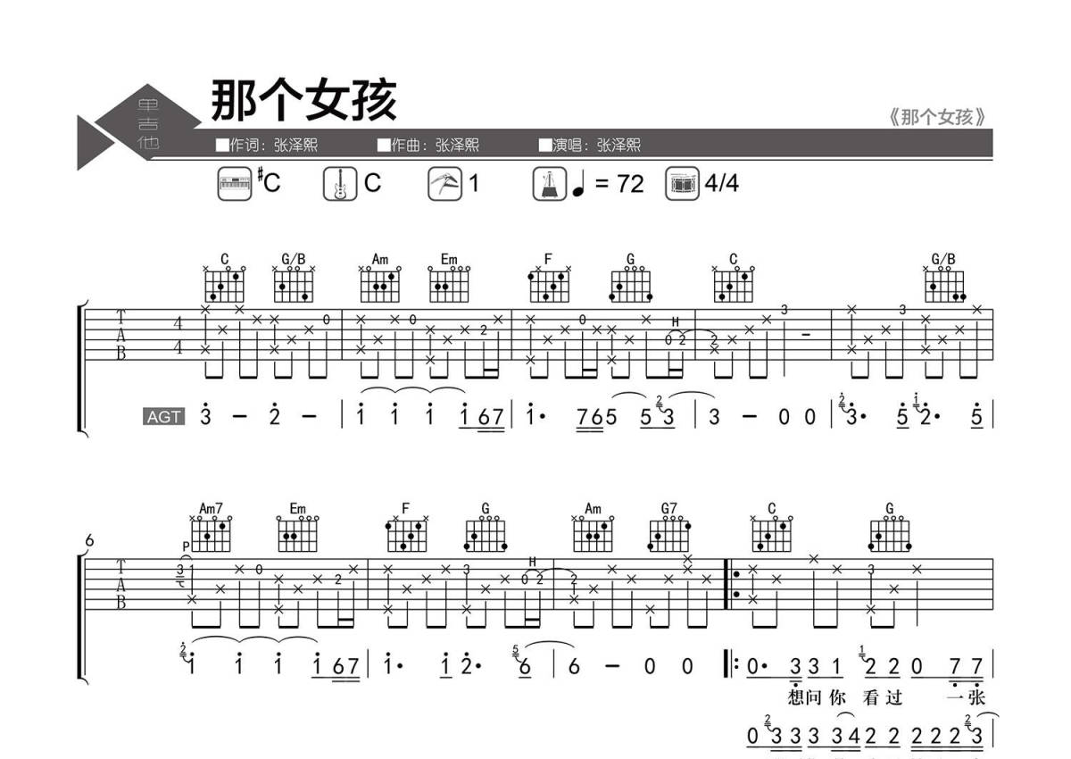 《那个女孩》是张泽熙演唱的一首歌曲,精编弹唱,拍号为4/4拍,歌曲速度为每分钟72拍,歌曲原调为Db调,但由于原调指法比较难,为了方便弹奏,本吉他谱采用的是C调指法编配,变调夹1品弹奏即为原调,当然也可以根据自己的音域改变变调夹位置,或者通过改变和弦调性,以方便自己弹奏,这份吉他谱共有三张高清图谱,图谱由 @老杨教吉他 编配上传,图谱使用六线谱编配,包含吉他和弦指法、简谱以及歌词部分,使用这份那个女孩吉他谱,可以让你更加方便地掌握这首歌曲的弹唱技巧,快来尝试吧。【调弦】标准调弦。 【基本信息】原曲#C调,选调C,变调夹夹1品,每分钟72拍。 【编配情况】根据原曲精细整理。 【和弦难度】大横按。 【节奏难度】最小时值16分音符。 【难点】前奏、间奏的指法安排与连贯性。 【技巧说明】H为【击弦】、P为【勾弦】。