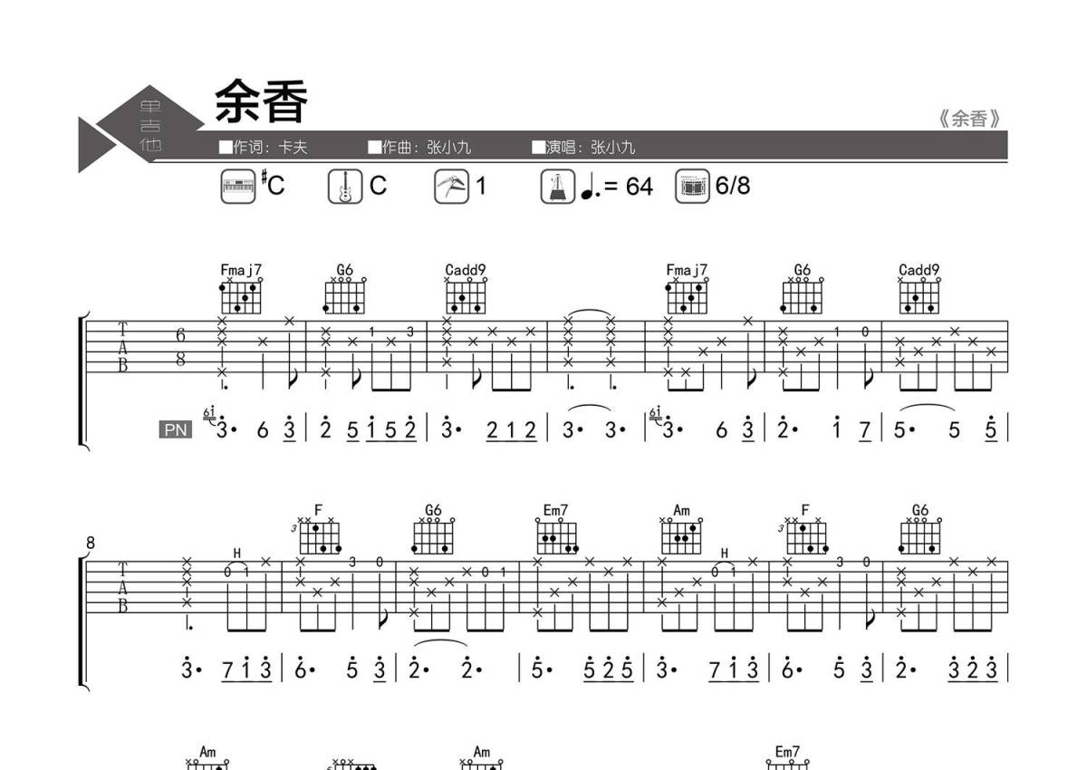 《余香》是张小九演唱的一首歌曲,精编弹唱,拍号为6/8拍,歌曲速度为每分钟64拍,歌曲原调为Db调,但由于原调指法比较难,为了方便弹奏,本吉他谱采用的是C调指法编配,变调夹1品弹奏即为原调,当然也可以根据自己的音域改变变调夹位置,或者通过改变和弦调性,以方便自己弹奏,这份吉他谱共有四张高清图谱,图谱由 @老杨教吉他 编配上传,图谱使用六线谱编配,包含吉他和弦指法、简谱以及歌词部分,使用这份余香吉他谱,可以让你更加方便地掌握这首歌曲的弹唱技巧,快来尝试吧。【调弦】标准调弦。 【基本信息】原曲#C调,选调C,变调夹夹1品,6/8拍,每分钟64拍。 【编配情况】根据原曲精细整理。 【和弦难度】和弦的特殊按法、大横按和弦。 【节奏难度】最小时值16分音符,注意三连音律动、节奏的变化及扫弦的层次。 【难点】前奏指法安排,和弦中的过渡音,节奏的变化。 【技巧说明】H为【击弦】;T.H为【拍弦泛音】(右手中指拍或食指拍泛音点);+为【敲板】(1弦拨弦带+为中指与无名指敲击吉他下后方侧板[或用拇指敲击琴箱上部面板边缘];6弦拨弦带+为掌根敲击6弦上方面板);拨弦后带斜杠为【无尾滑音】。