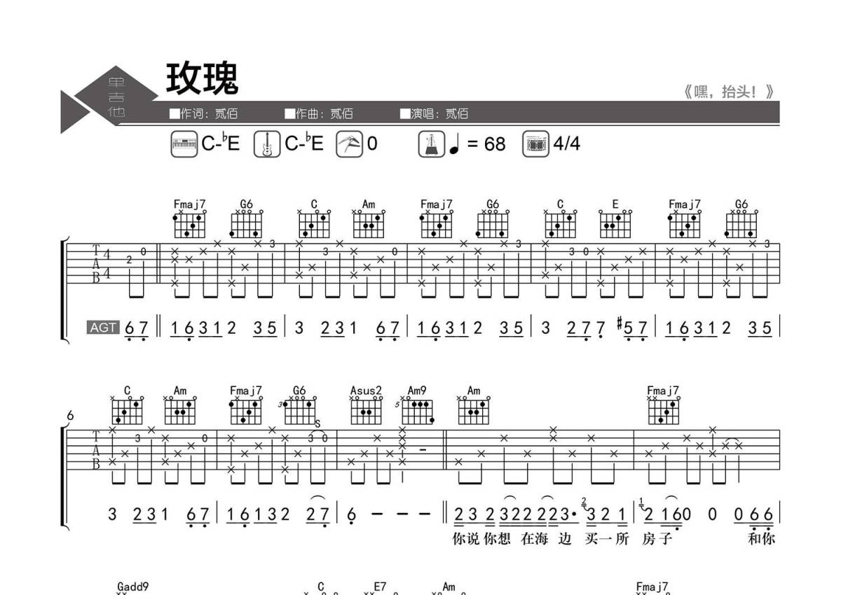 《玫瑰》是贰佰演唱的一首歌曲,精编弹唱,拍号为4/4拍,歌曲速度为每分钟68拍,歌曲原调为C调,本吉他谱采用的是C调指法编配,演奏时不需要使用变调夹即为原调,这份吉他谱共有三张高清图谱,图谱由 @老杨教吉他 编配上传,图谱使用六线谱编配,包含吉他和弦指法、简谱以及歌词部分,使用这份玫瑰吉他谱,可以让你更加方便地掌握这首歌曲的弹唱技巧,快来尝试吧。【调弦】标准调弦。 【基本信息】原曲C-bE调,选调C-bE,4/4拍,每分钟68拍。 【编配情况】根据原曲精细整理。 【和弦难度】和弦的特殊按法、大横按。 【节奏难度】最小时值16分音符。 【难点】前奏、间奏的指法安排。 【技巧说明】S为【滑音】。