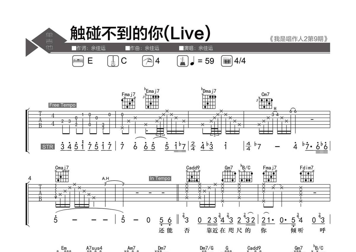 《触碰不到的你(Live)》是余佳运演唱的一首歌曲,精编弹唱,拍号为4/4拍,歌曲速度为每分钟59拍,歌曲原调为E调,但由于原调指法比较难,为了方便弹奏,本吉他谱采用的是C调指法编配,变调夹4品弹奏即为原调,当然也可以根据自己的音域改变变调夹位置,或者通过改变和弦调性,以方便自己弹奏,这份吉他谱共有三张高清图谱,图谱由 @老杨教吉他 编配上传,图谱使用六线谱编配,包含吉他和弦指法、简谱以及歌词部分,使用这份触碰不到的你(Live)吉他谱,可以让你更加方便地掌握这首歌曲的弹唱技巧,快来尝试吧。【调弦】标准调弦。 【基本信息】原曲E调,选调C,变调夹夹4品,4/4拍,每分钟59拍。 【编配情况】根据原曲精细整理改编。 【和弦难度】和弦的特殊按法、大跨度和弦、不常用和弦、大横按。 【节奏难度】最小时值32分音符,含少量附点与切分节奏。 【难点】节奏的变化,和弦的快速转换。 【技巧说明】H为【击弦】;A.H为【人工泛音】;拨弦带框为【拍弦】。