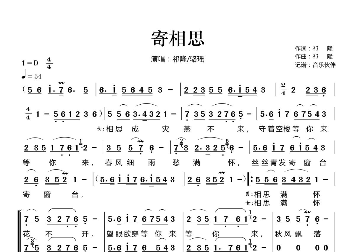 寄相思简谱 - 祁隆/骆瑶演唱