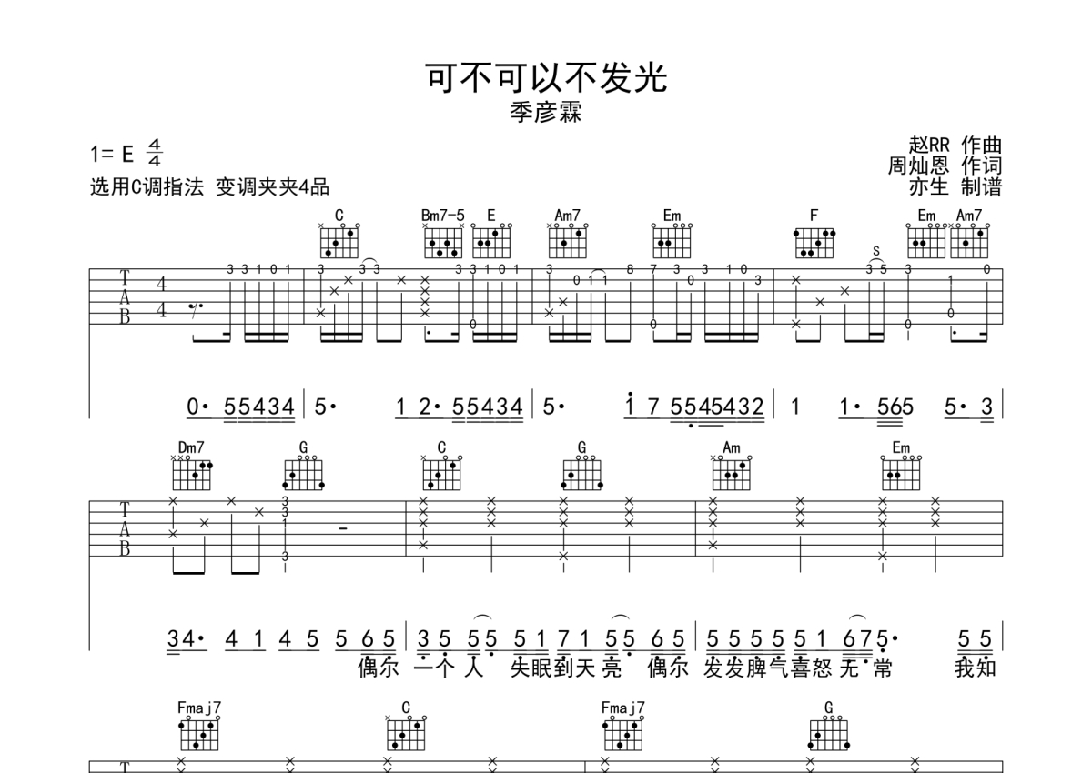 《可不可以不发光》是季彦霖演唱的一首歌曲,拍号为4/4拍,歌曲原调为E调,但由于原调指法比较难,为了方便弹奏,本吉他谱采用的是C调指法编配,变调夹4品弹奏即为原调,当然也可以根据自己的音域改变变调夹位置,或者通过改变和弦调性,以方便自己弹奏,这份吉他谱共有两张高清图谱,图谱由 @亦生 编配上传,图谱使用六线谱编配,包含吉他和弦指法、简谱以及歌词部分,使用这份可不可以不发光吉他谱,可以让你更加方便地掌握这首歌曲的弹唱技巧,快来尝试吧。