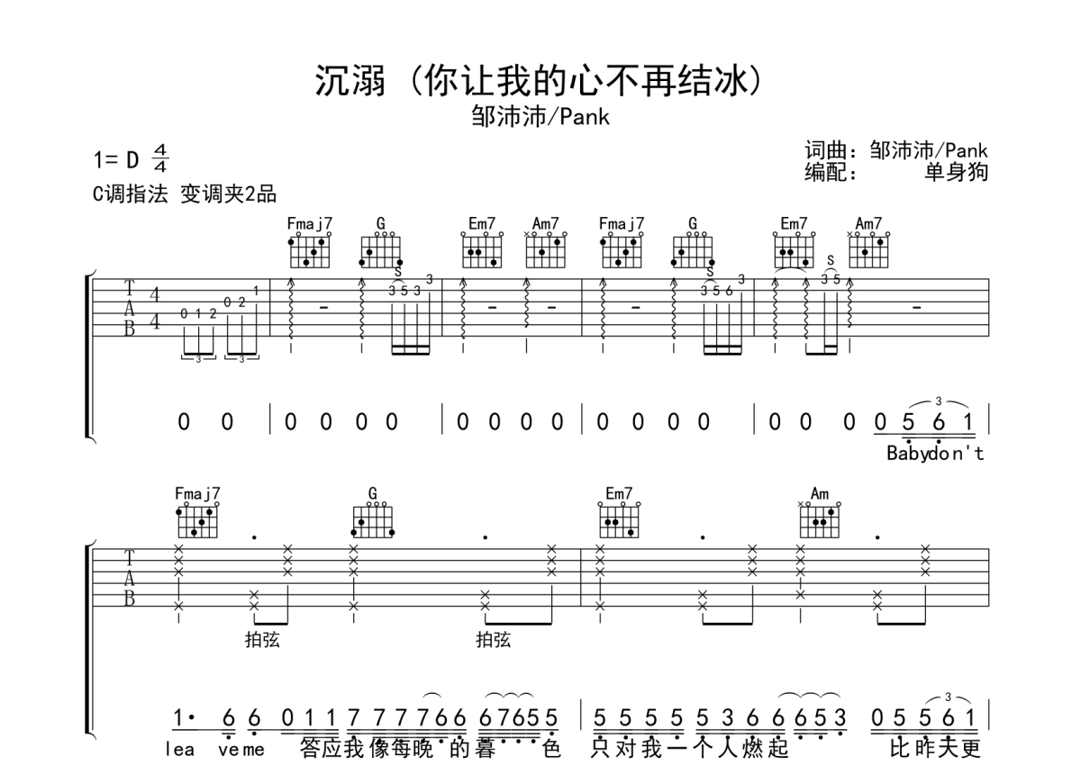 《沉溺 (你让我的心不再结冰)》是邹沛沛/Pank演唱的一首歌曲,拍号为4/4拍,歌曲原调为D调,但由于原调指法比较难,为了方便弹奏,本吉他谱采用的是C调指法编配,变调夹2品弹奏即为原调,当然也可以根据自己的音域改变变调夹位置,或者通过改变和弦调性,以方便自己弹奏,这份吉他谱共有四张高清图谱,图谱由 @单身狗 编配上传,图谱使用六线谱编配,包含吉他和弦指法、简谱以及歌词部分,使用这份沉溺 (你让我的心不再结冰)吉他谱,可以让你更加方便地掌握这首歌曲的弹唱技巧,快来尝试吧。