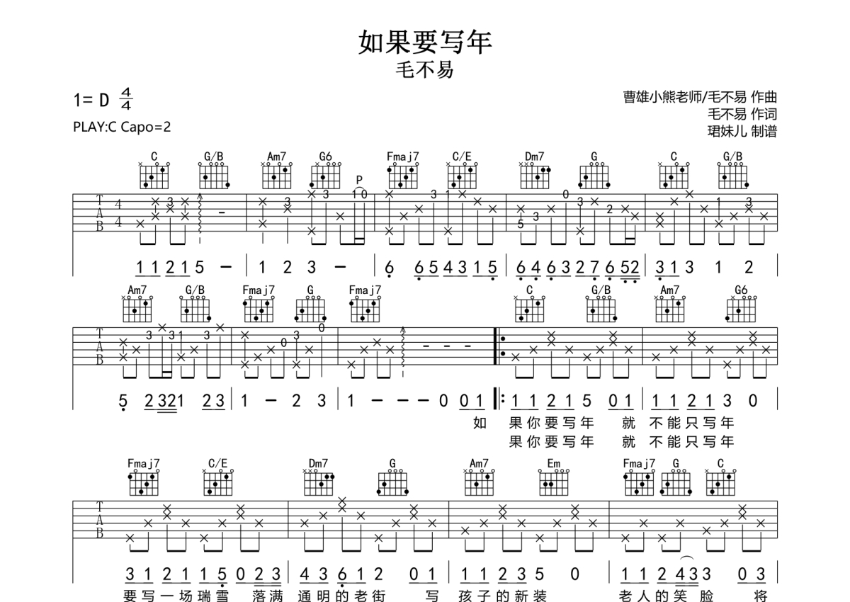 《如果要写年》是毛不易演唱的一首歌曲,拍号为4/4拍,歌曲原调为D调,但由于原调指法比较难,为了方便弹奏,本吉他谱采用的是C调指法编配,变调夹2品弹奏即为原调,当然也可以根据自己的音域改变变调夹位置,或者通过改变和弦调性,以方便自己弹奏,这份吉他谱共有两张高清图谱,图谱由 @珺妹儿 编配上传,图谱使用六线谱编配,包含吉他和弦指法、简谱以及歌词部分,使用这份如果要写年吉他谱,可以让你更加方便地掌握这首歌曲的弹唱技巧,快来尝试吧。