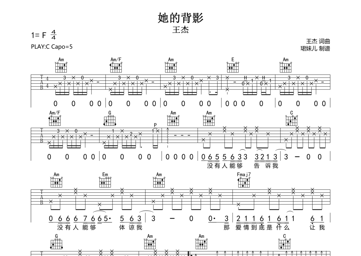 《她的背影》是王杰演唱的一首歌曲,拍号为4/4拍,歌曲速度为每分钟85拍,歌曲原调为C调,本吉他谱采用的是C调指法编配,变调夹5品弹奏即为原调,当然也可以根据自己的音域改变变调夹位置,或者通过改变和弦调性,以方便自己弹奏,这份吉他谱共有两张高清图谱,图谱由 @珺妹儿 编配上传,图谱使用六线谱编配,包含吉他和弦指法、简谱以及歌词部分,使用这份她的背影吉他谱,可以让你更加方便地掌握这首歌曲的弹唱技巧,快来尝试吧。