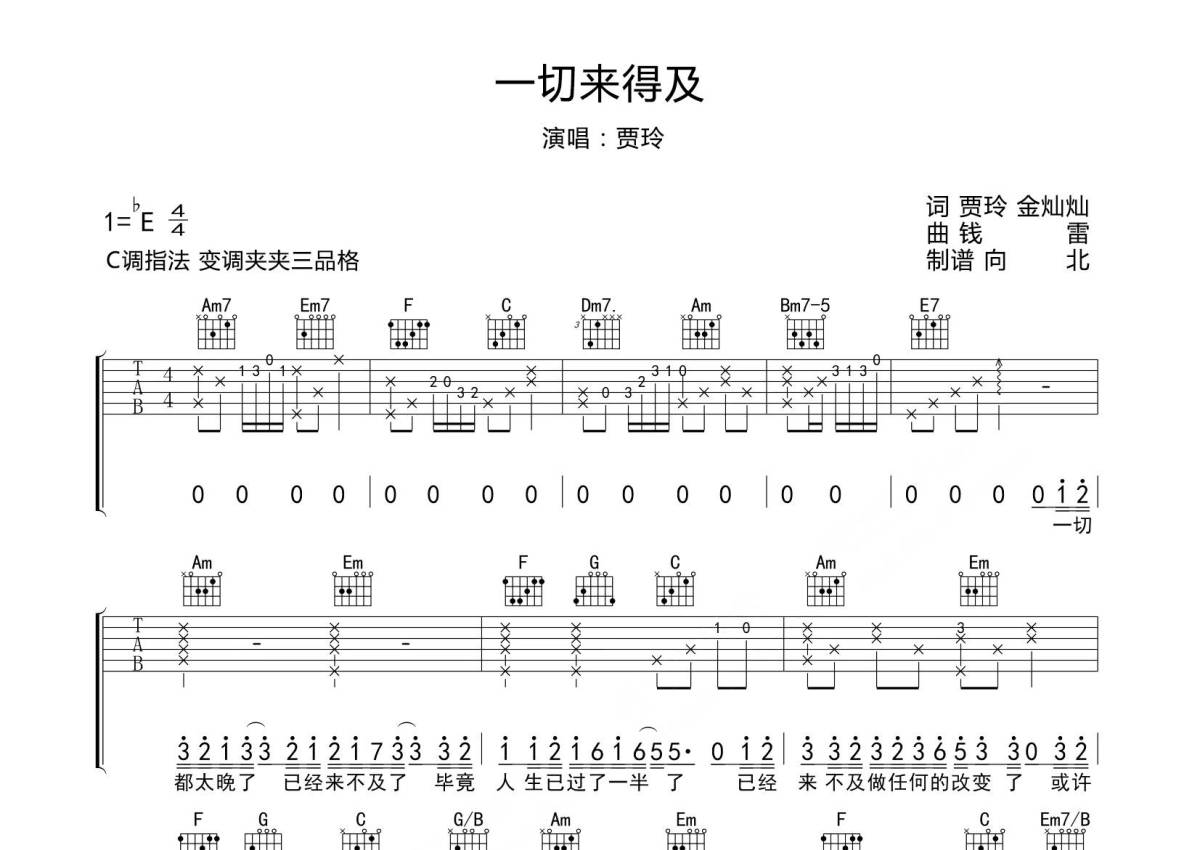 《一切都来得及》是贾玲演唱的一首歌曲,专辑版,拍号为4/4拍,歌曲原调为Eb调,但由于原调指法比较难,为了方便弹奏,本吉他谱采用的是C调指法编配,变调夹3品弹奏即为原调,当然也可以根据自己的音域改变变调夹位置,或者通过改变和弦调性,以方便自己弹奏,这份吉他谱共有四张高清图谱,图谱由 @圆创吉他谱 编配上传,图谱使用六线谱编配,包含吉他和弦指法、简谱以及歌词部分,曲谱配备了相关的音频提供试听,使用这份一切都来得及吉他谱,可以让你更加方便地掌握这首歌曲的弹唱技巧,快来尝试吧。